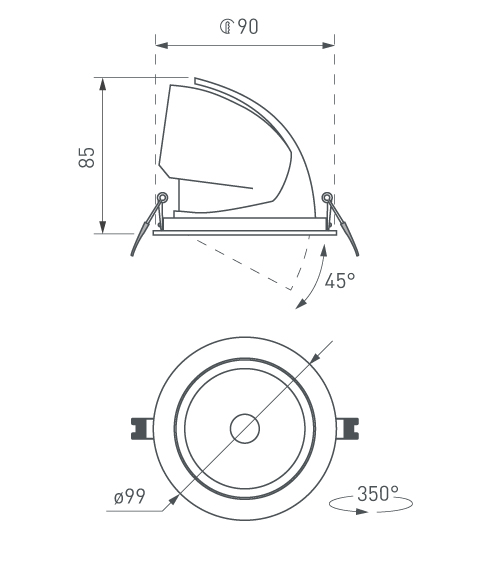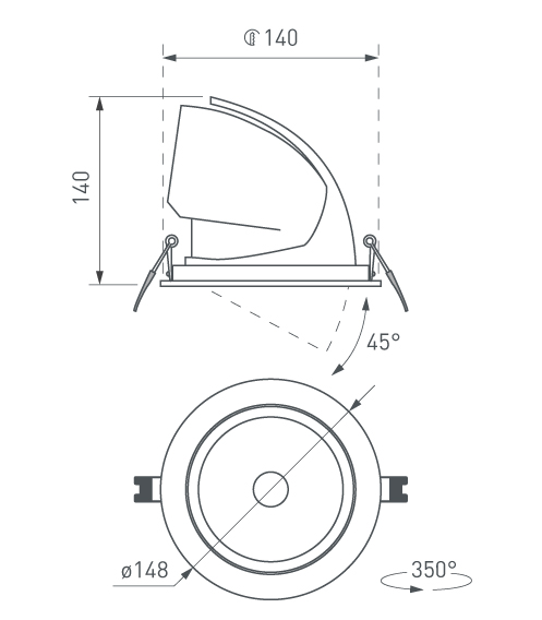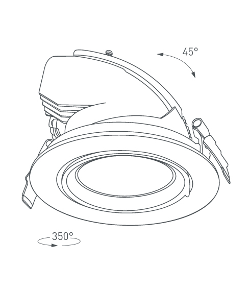 Конструкция светильника со специальным механизмом регулировки позволяет поворачивать световой модуль на 350° и задавать угол наклона в диапазоне от 0 до 45°. Такая опция позволяет с легкостью расставлять световые акценты и менять направление света в случае необходимости, например, при смене товарных позиций или их перестановки.