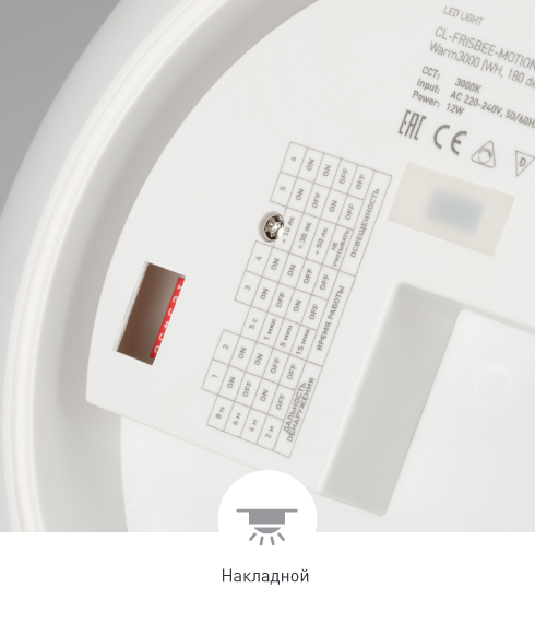 Модель FRISBEE-MOTION со встроенным микроволновым датчиком движения с дистанцией срабатывания до 8 м. Скрытое исполнение датчика позволяет не перегружать лаконичный дизайн светильника дополнительными элементами и сохранить эстетичный внешний вид.