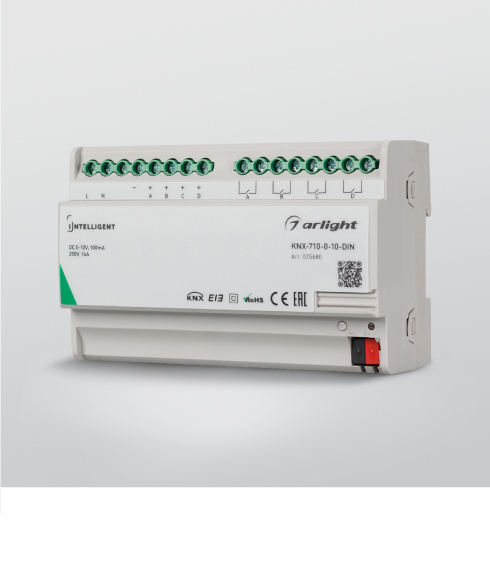 В серии доступны устройства, преобразующие команды KNX в сигнал 0/1–10 В или DALI.