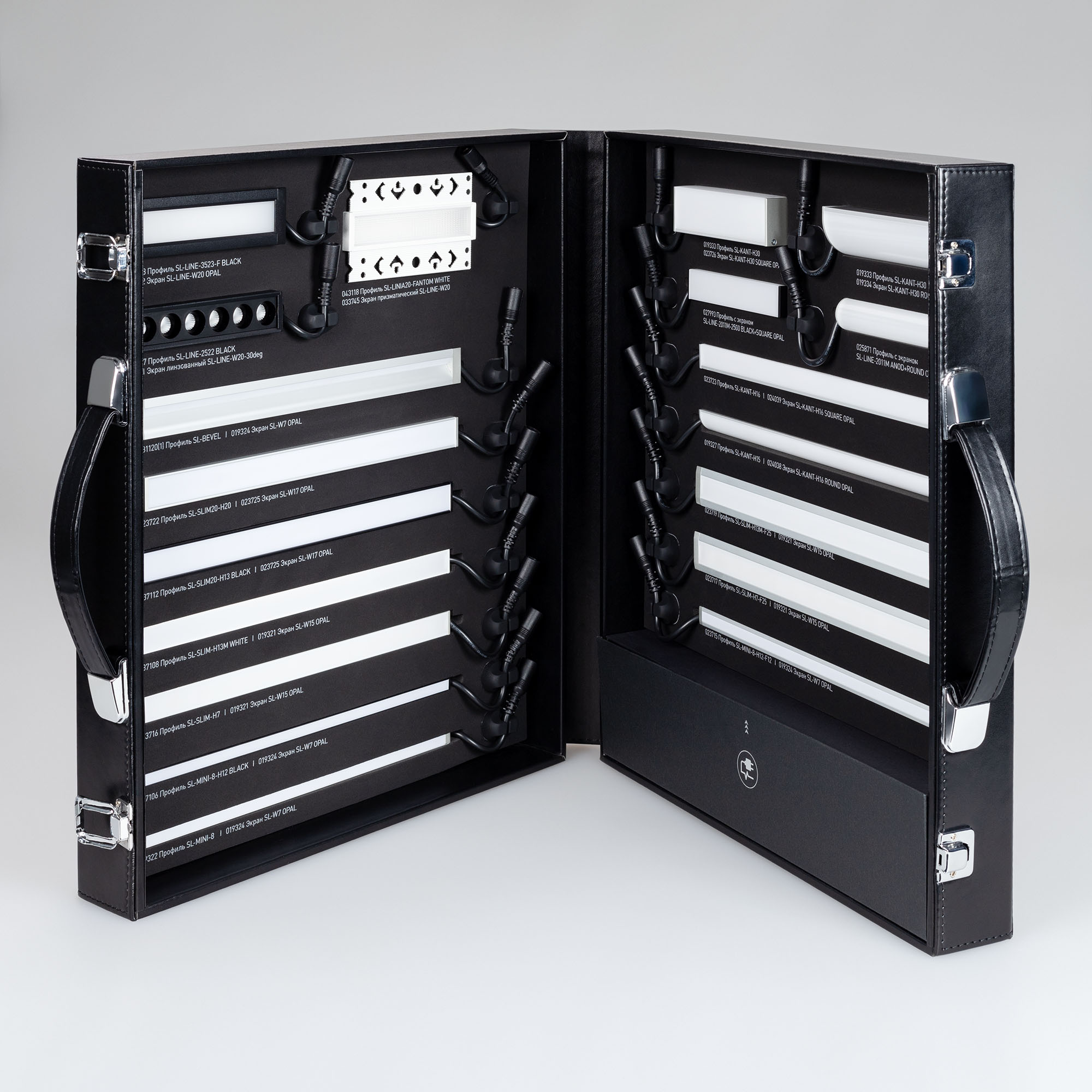 Демонстрационный набор образцов профиля SL-LINE-2011, SL-KANT-H16/H30, SL-SLIM/SLIM20, SL-MINI-8 в комплекте с экранами, светодиодной лентой напряжением 24В, заглушками, держателями. В комплекте идет блок питания для демонстрационного подключения.