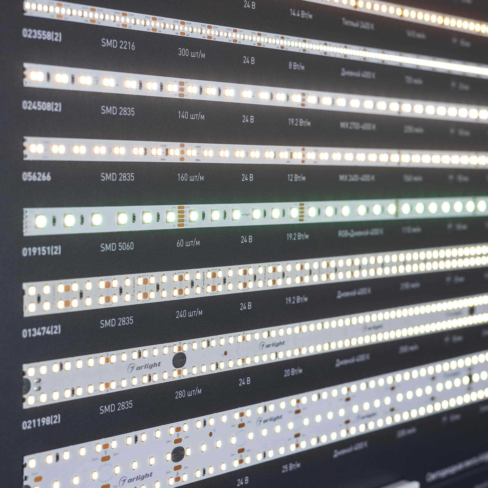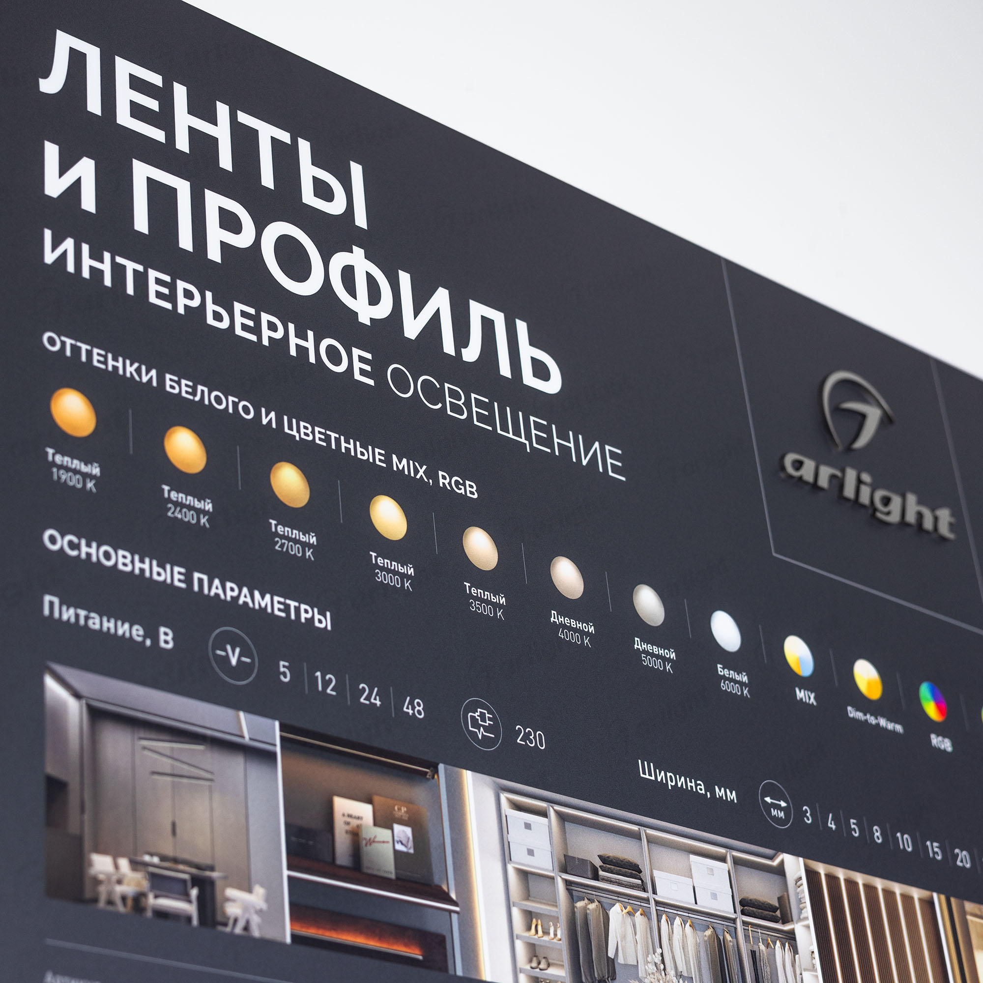 Обзорный стенд по ассортименту светодиодных лент и профилей.