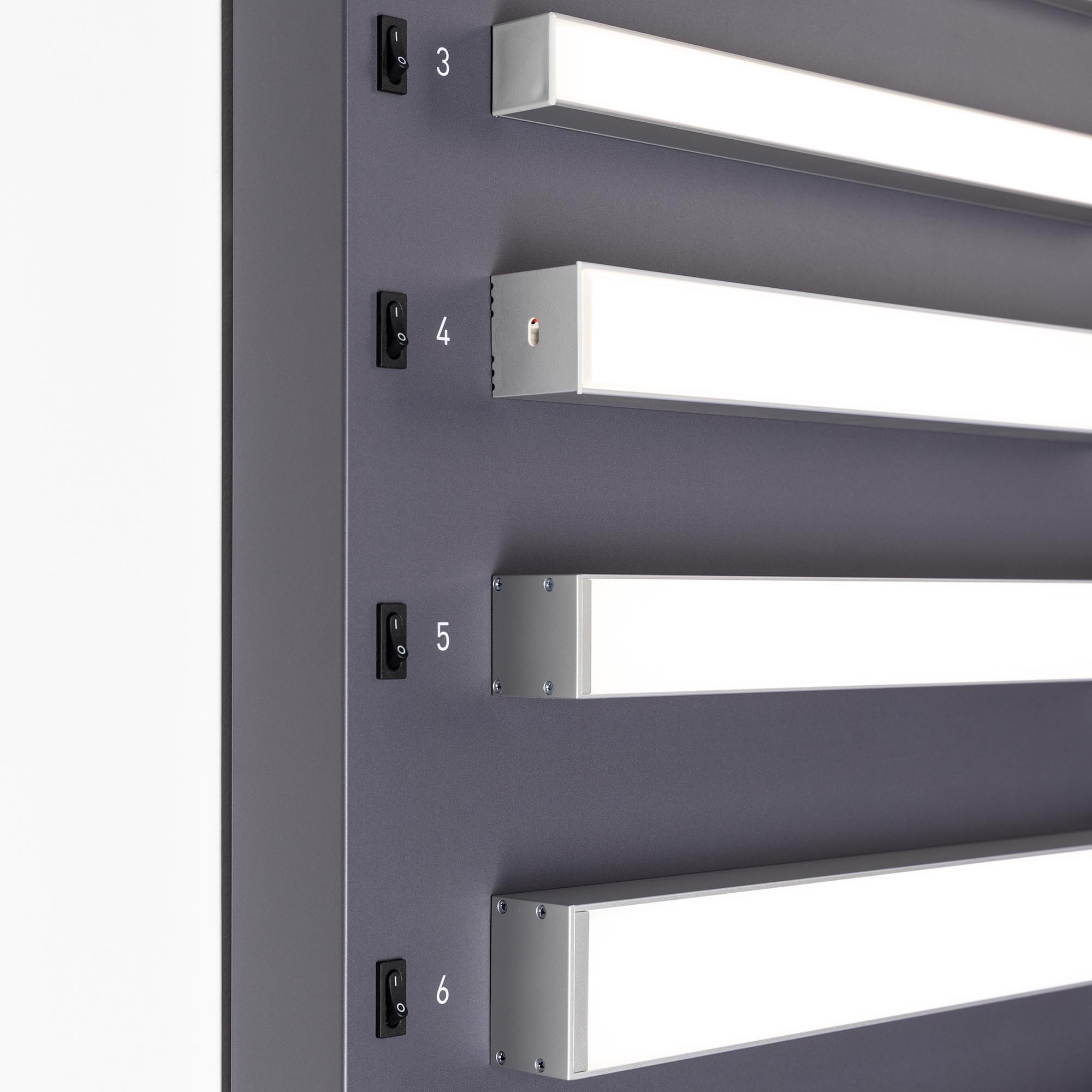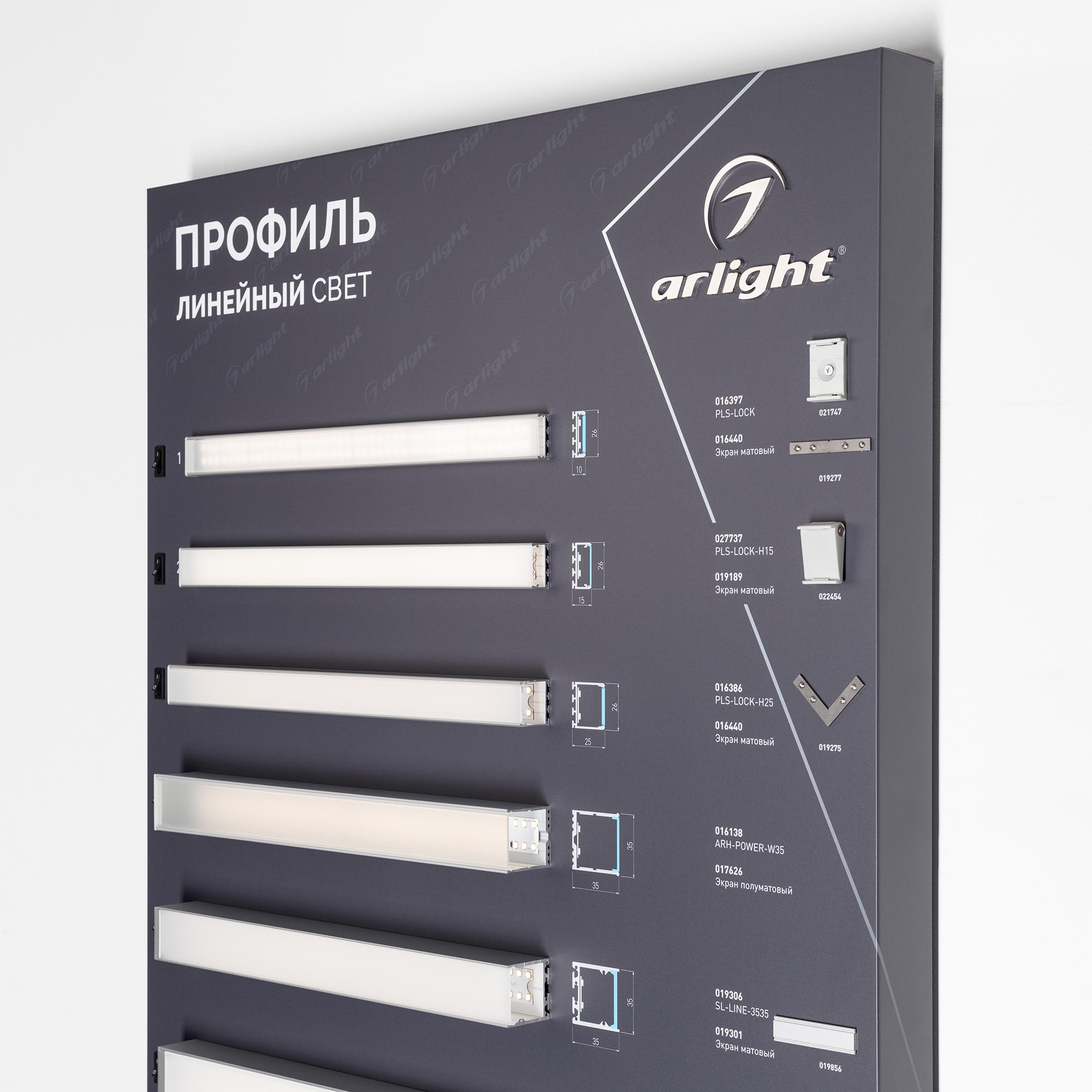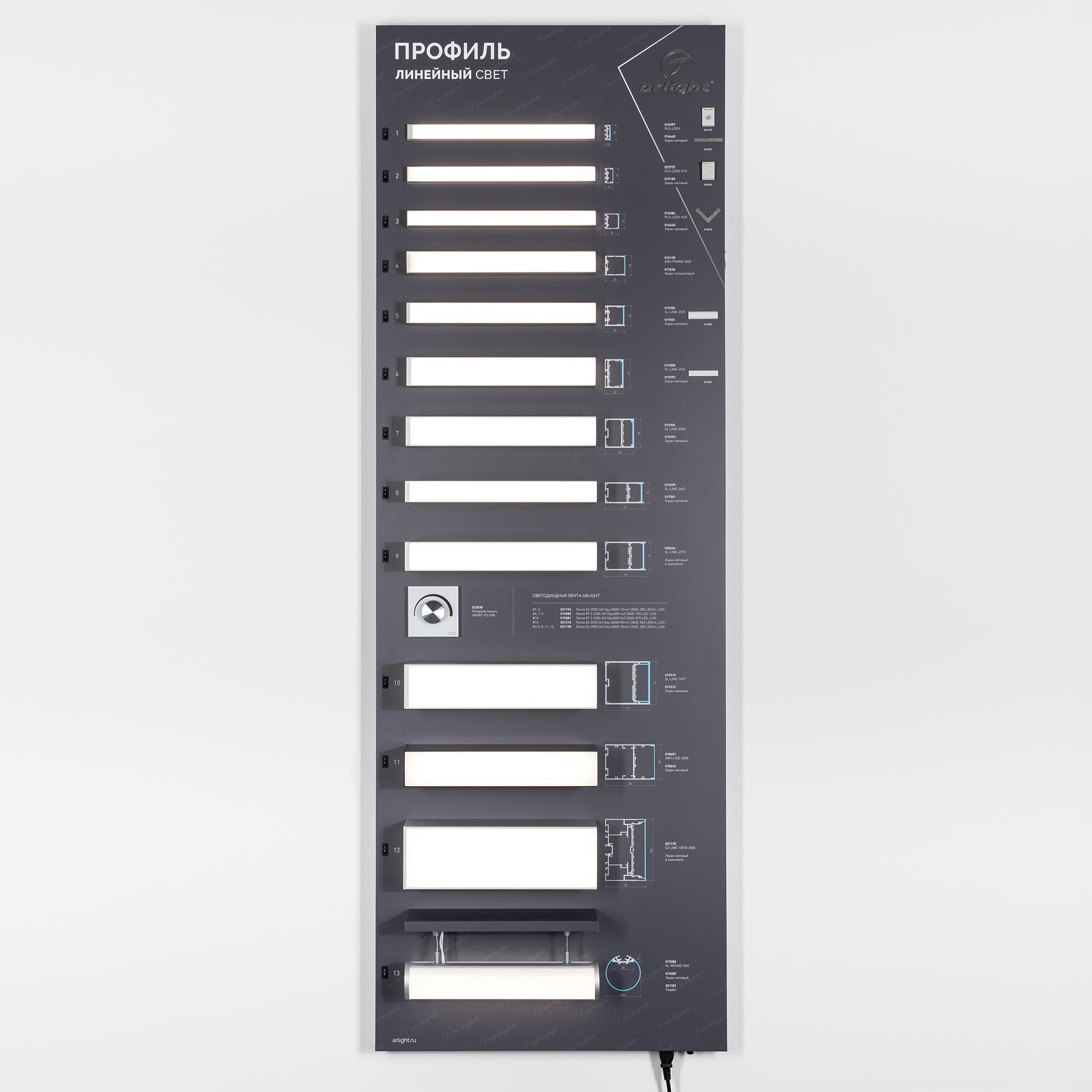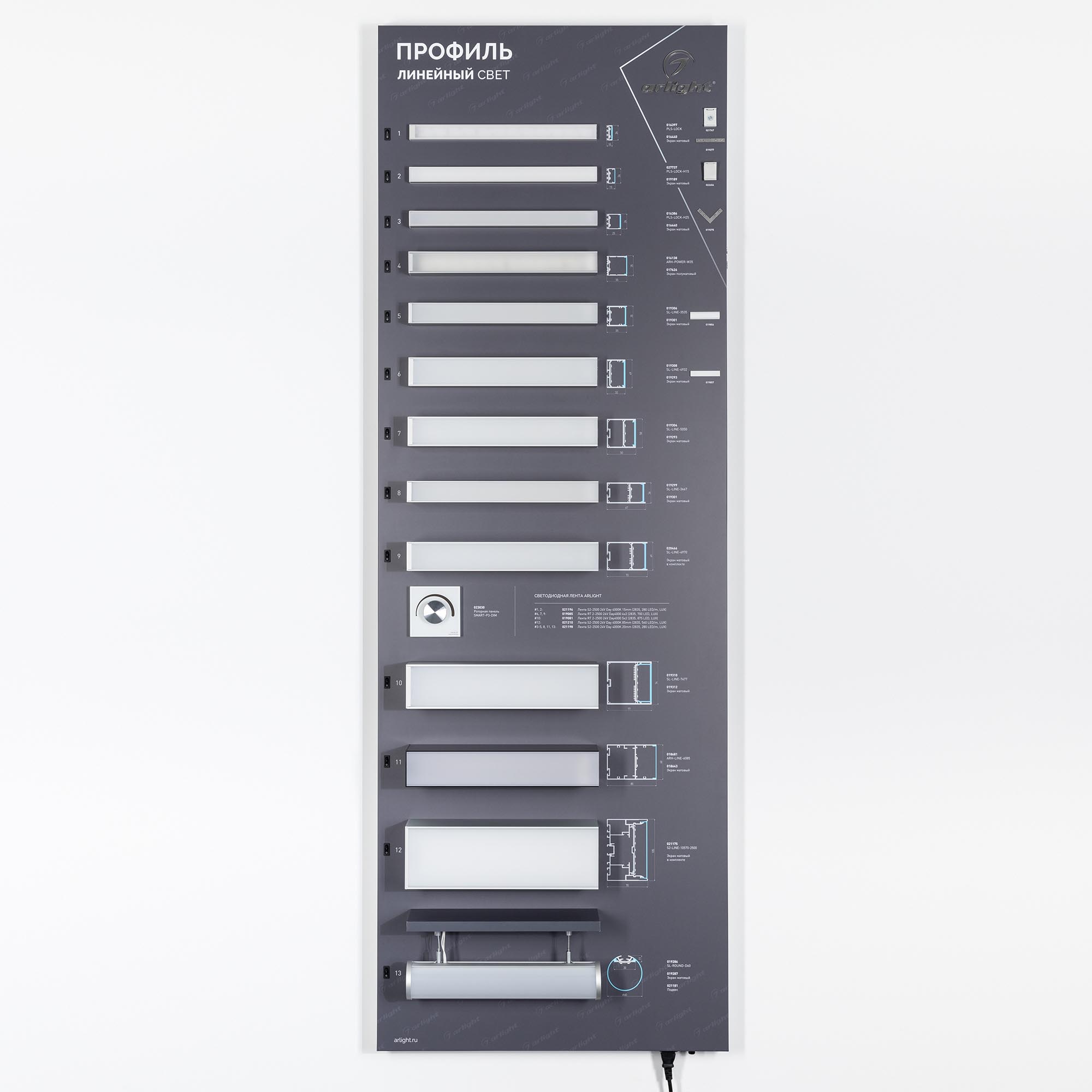 Версия 2. Стенд Алюминиевые Профили Линейный Свет со светодиодной лентой. 15 моделей широких накладных профилей, 1 подвесной круглый профиль. Материал - композит 3 мм, пленка, печать. Габаритные размеры (Ширина Х Высота Х Глубина), 600х1760х120 мм. Питание 230 В. Мощность 100 Вт.