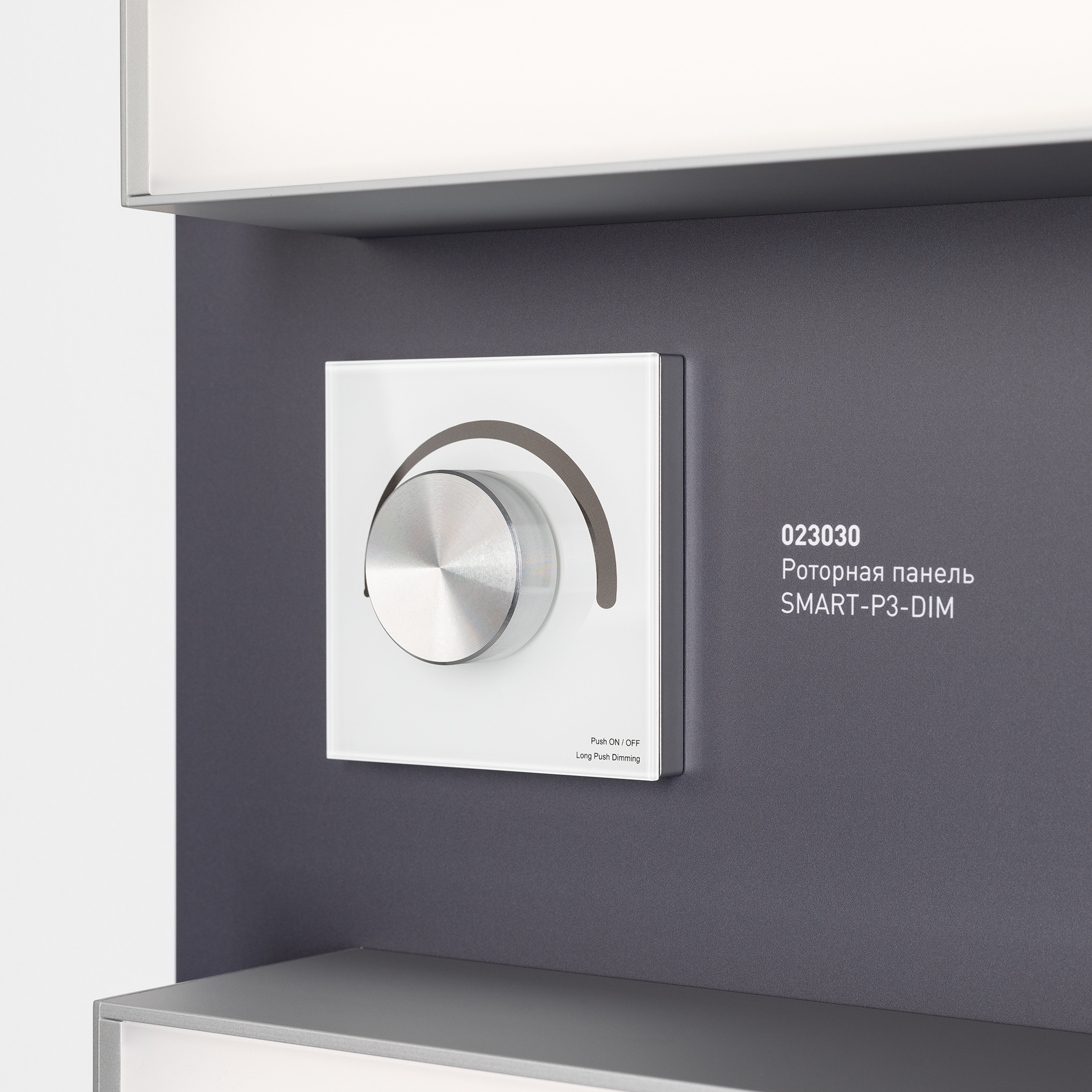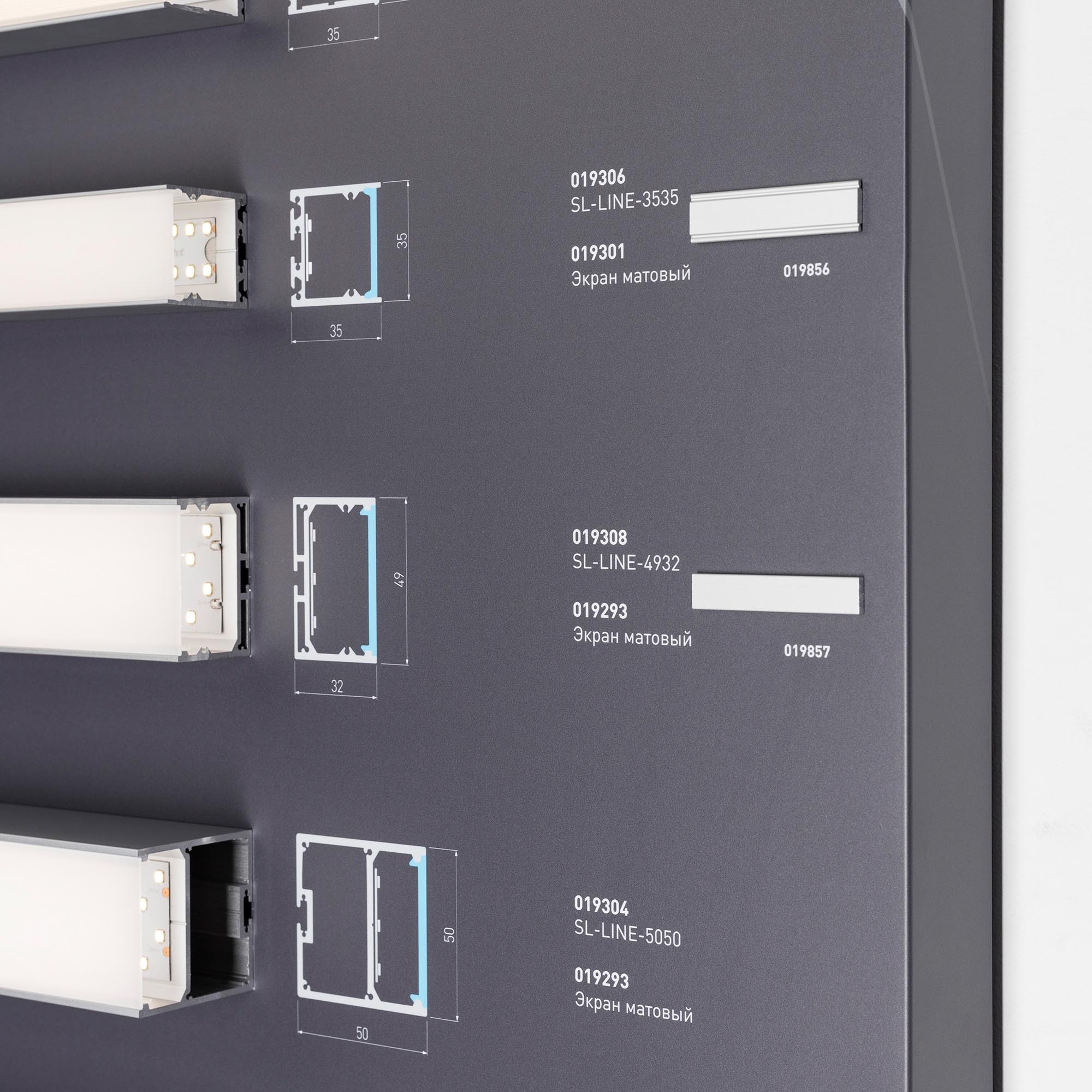 На стенде представлен ассортимент накладных/подвесных алюминиевых профилей для светодиодных лент для создания основного освещения.
