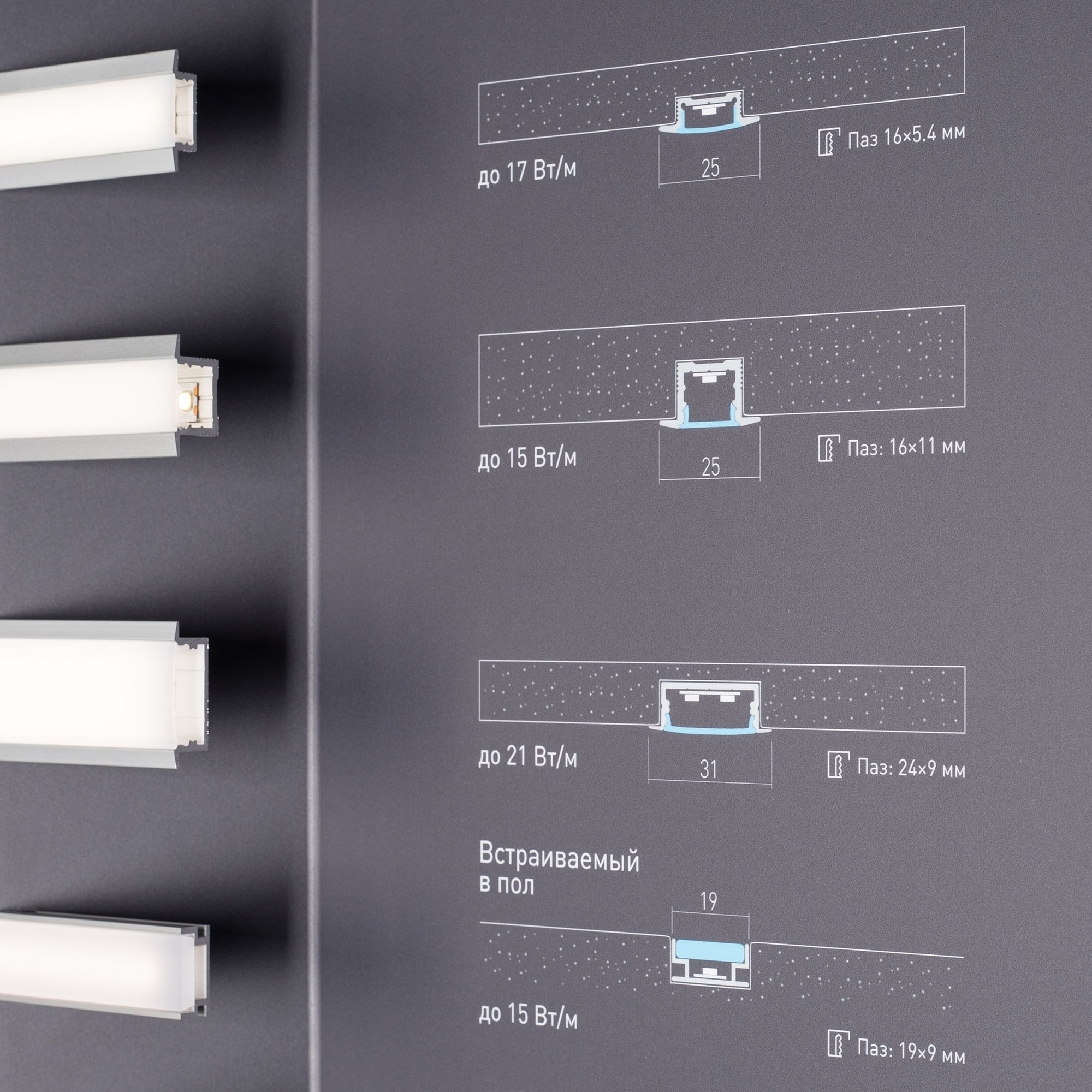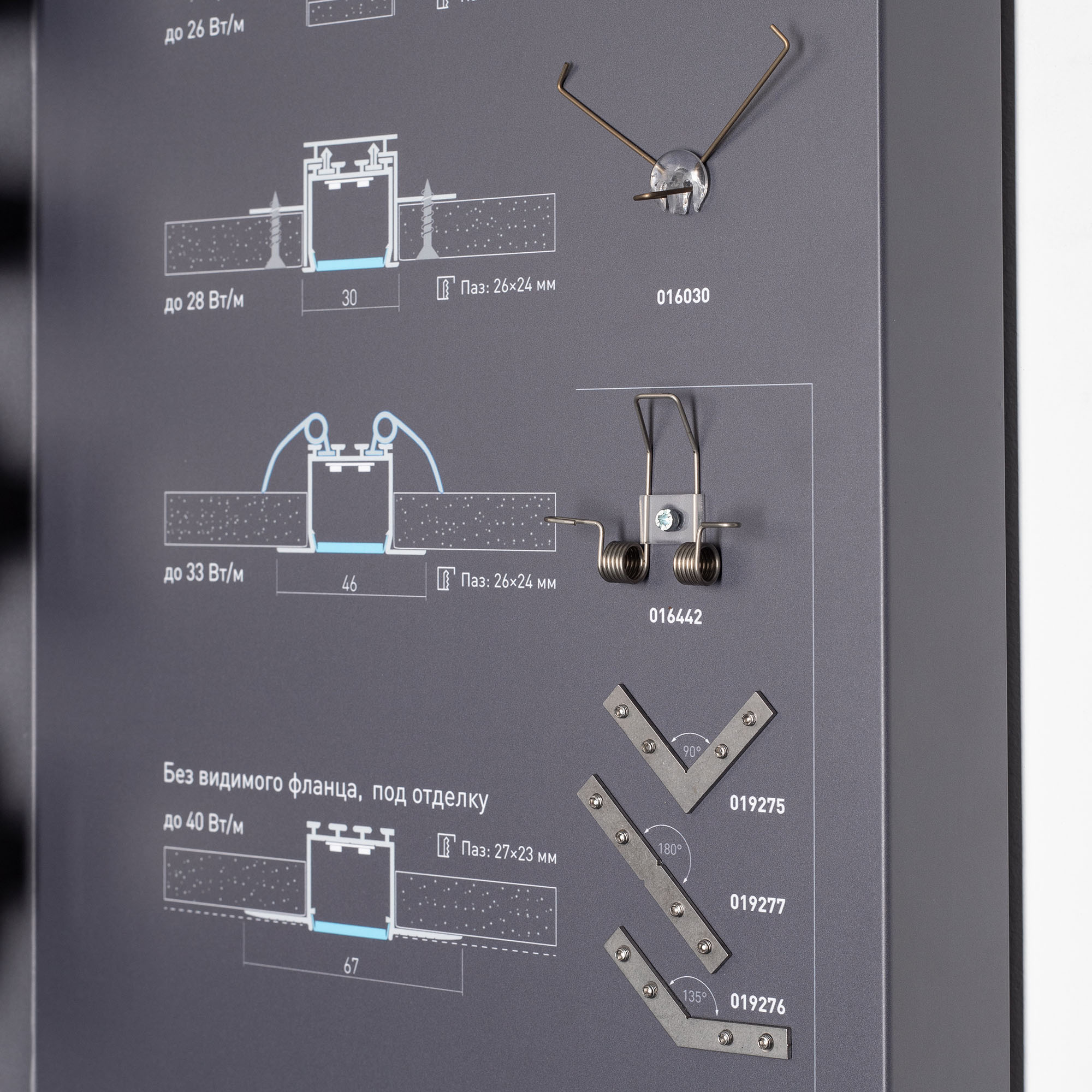 На стенде представлен ассортимент алюминиевых встраиваемых профилей для основного и декоративного освещения.