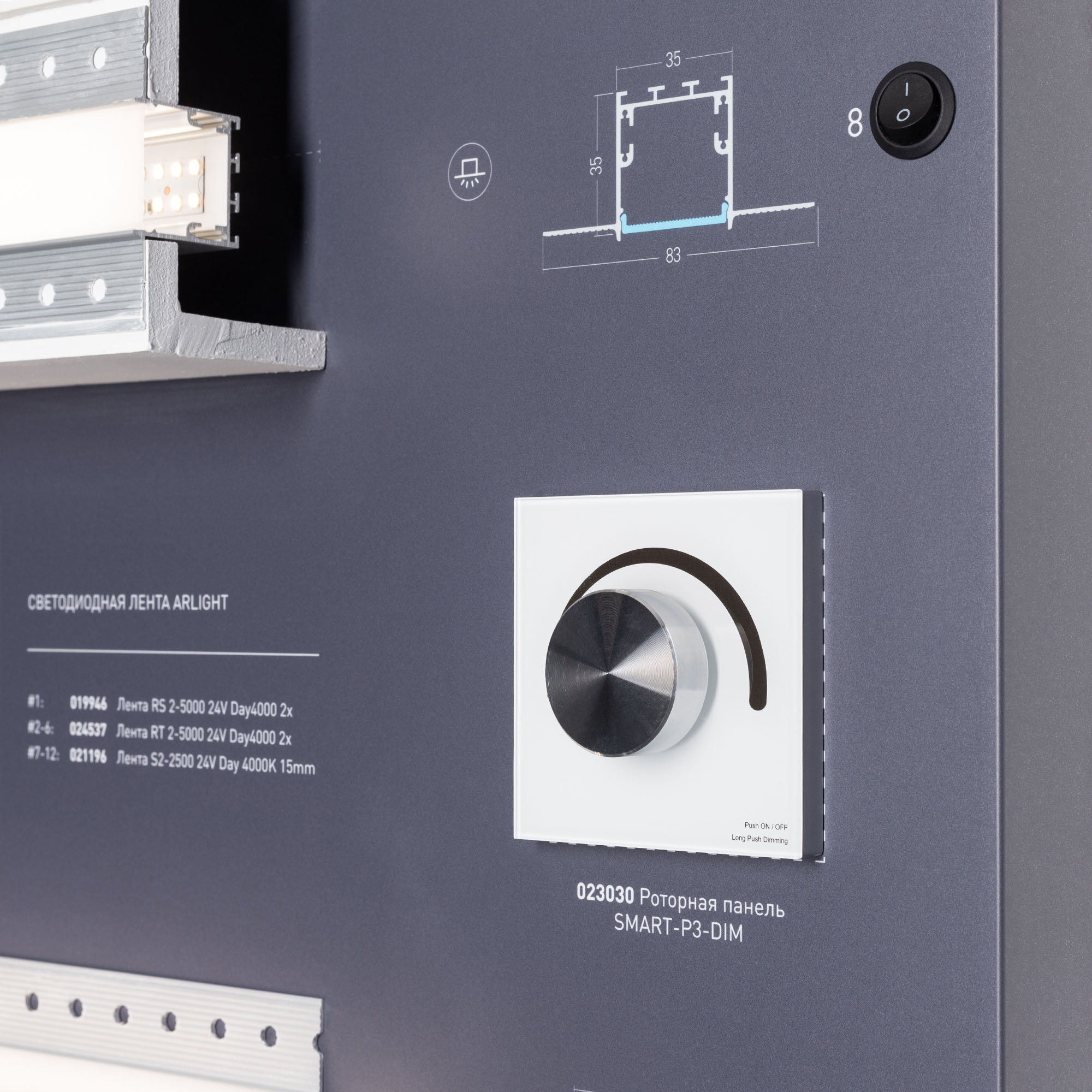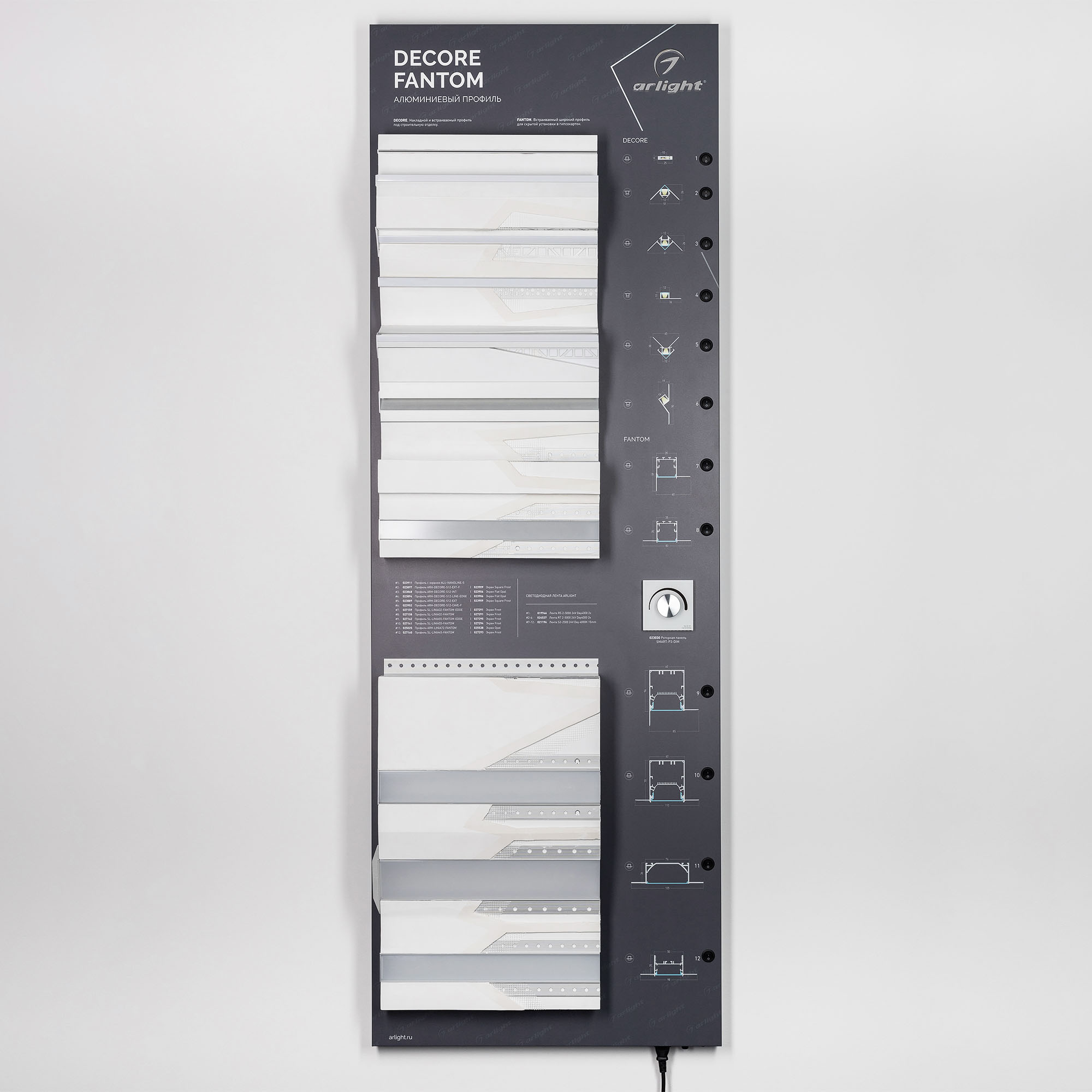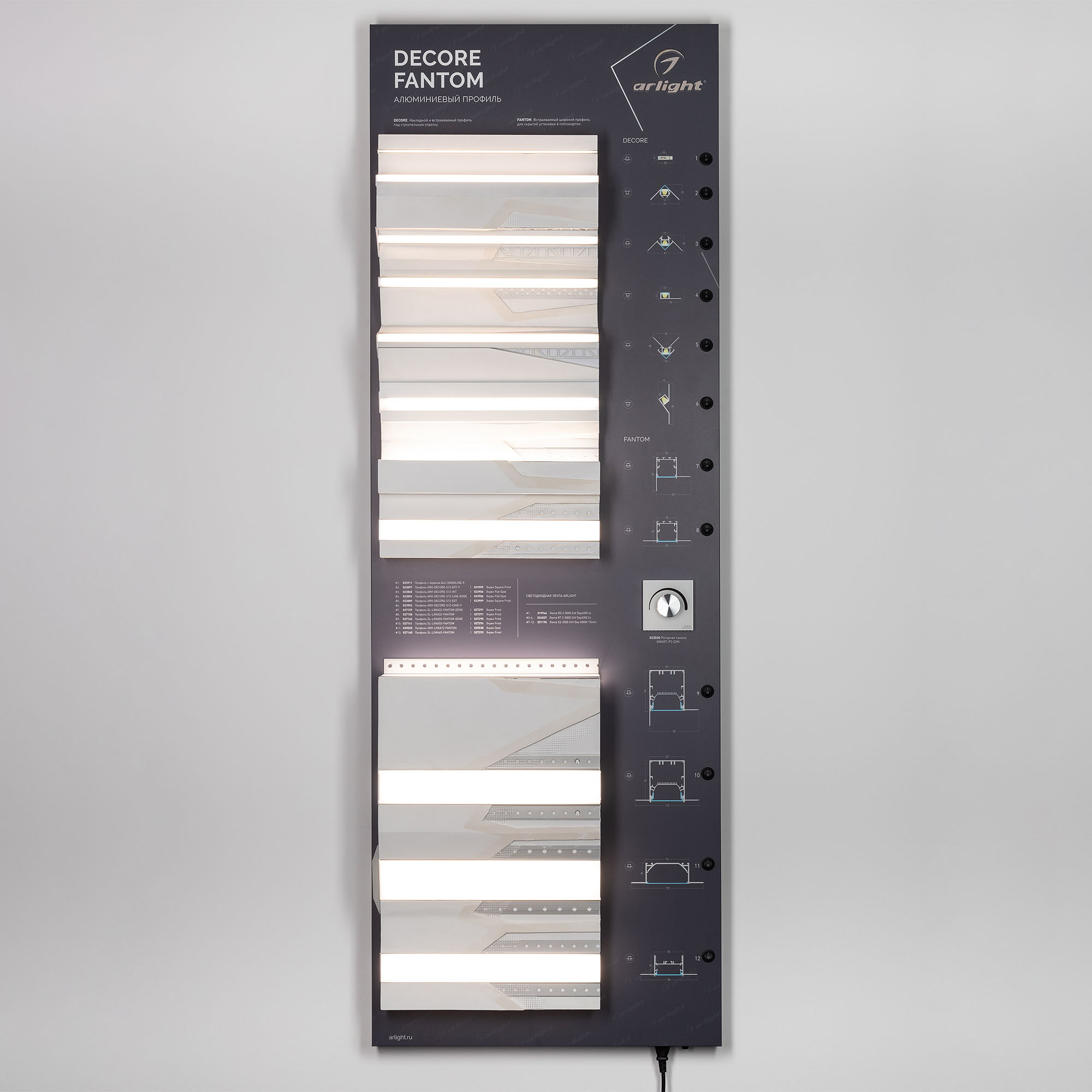 На стенде представлены алюминиевые профили для светодиодных лент серий FANTOM(широкие профили для скрытой встройки в гипсокартон) и DECORE (встраиваемые профили под строительную отделку).