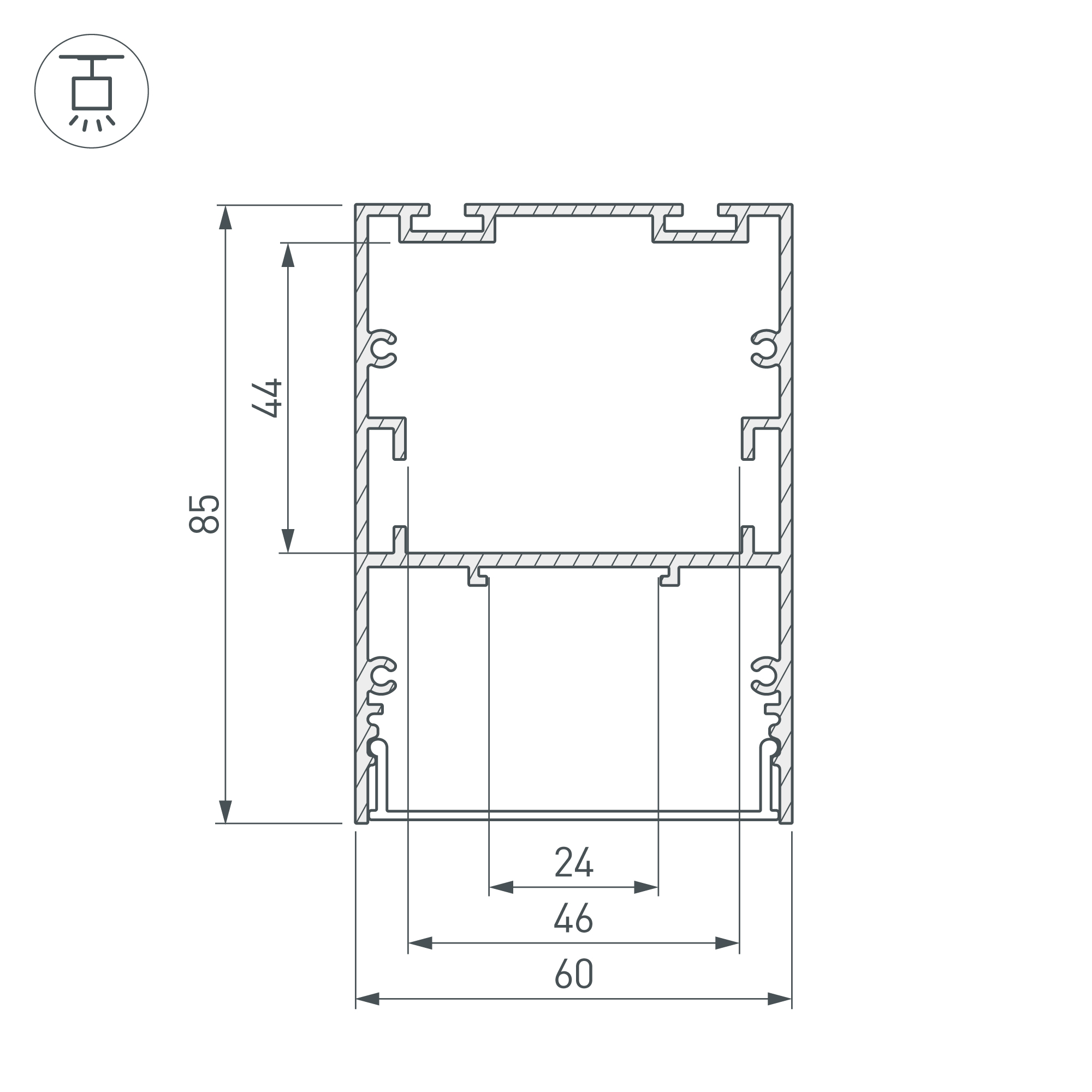 Габаритные размеры профиля составляют 2000 мм в длину, 60 мм в ширину и 85 мм в высоту. Площадка для установки светодиодных лент позволяет использовать ленту шириной до 22 мм и мощностью до 76 Вт/м. Это обеспечивает гибкость в выборе светодиодных лент и создает потрясающие световые решения.