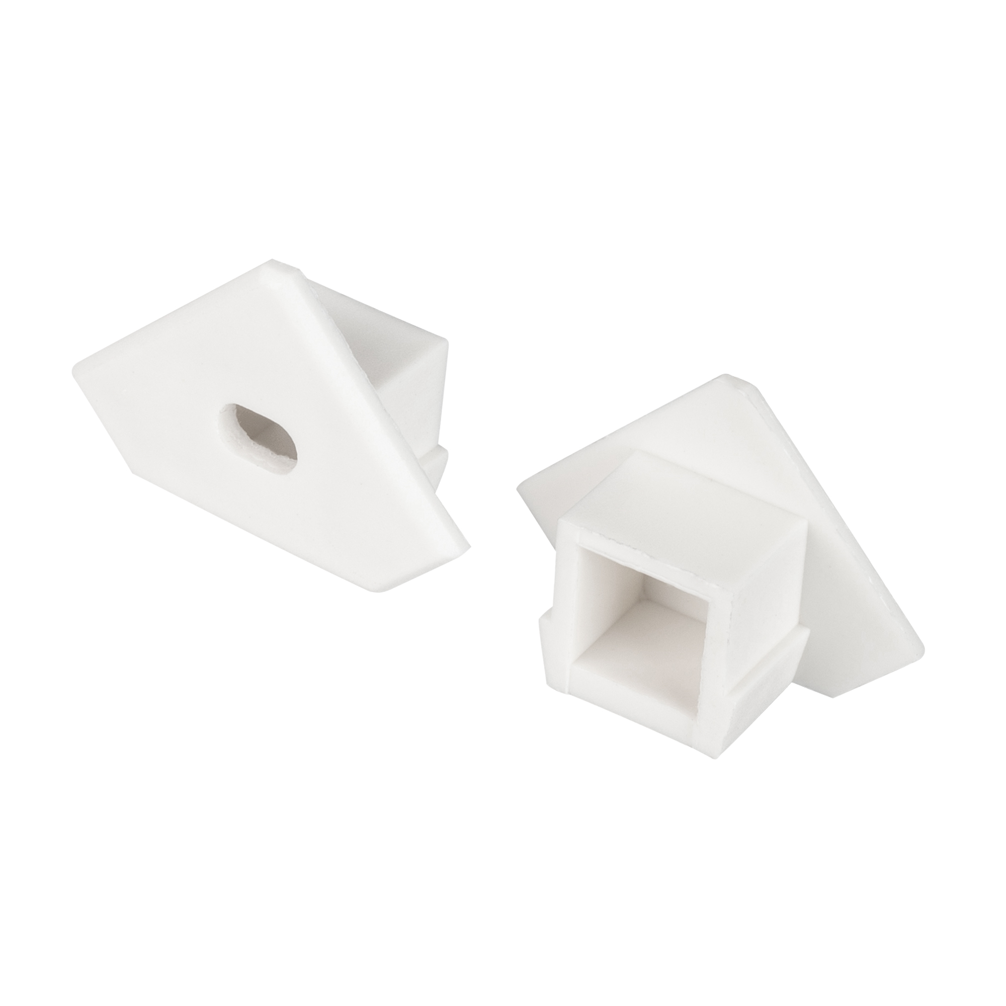 Белая заглушка с отверстием для углового профиля PDS45-T. Придает законченный вид светильнику, а также защищает светодиодную ленту от внешних факторов (грязи, пыли и прочего). Отверстие в заглушке позволяет вывести кабель питания светодиодной ленты.