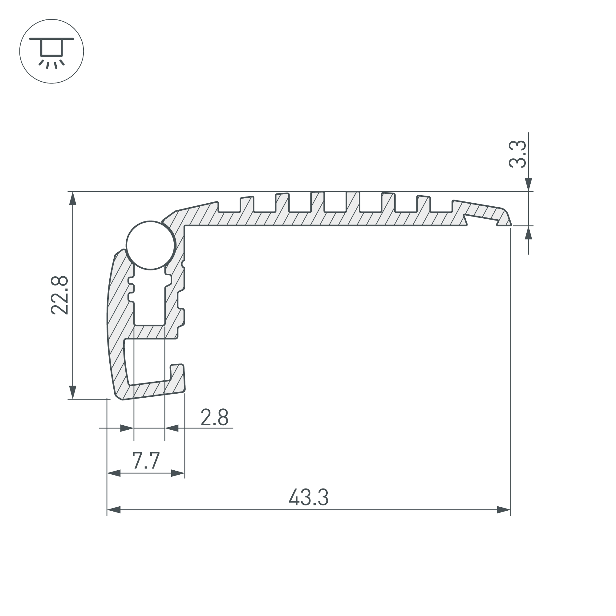 Алюминиевый анодированный компактный профиль для подсветки ступеней, с антискользящей вставкой. Габаритные размеры (L×W×H): 2000x43,2x22,7 мм. Ширина площадки для ленты 5 мм. Заглушки и другие аксессуары приобретаются отдельно. Цена за 1 метр.