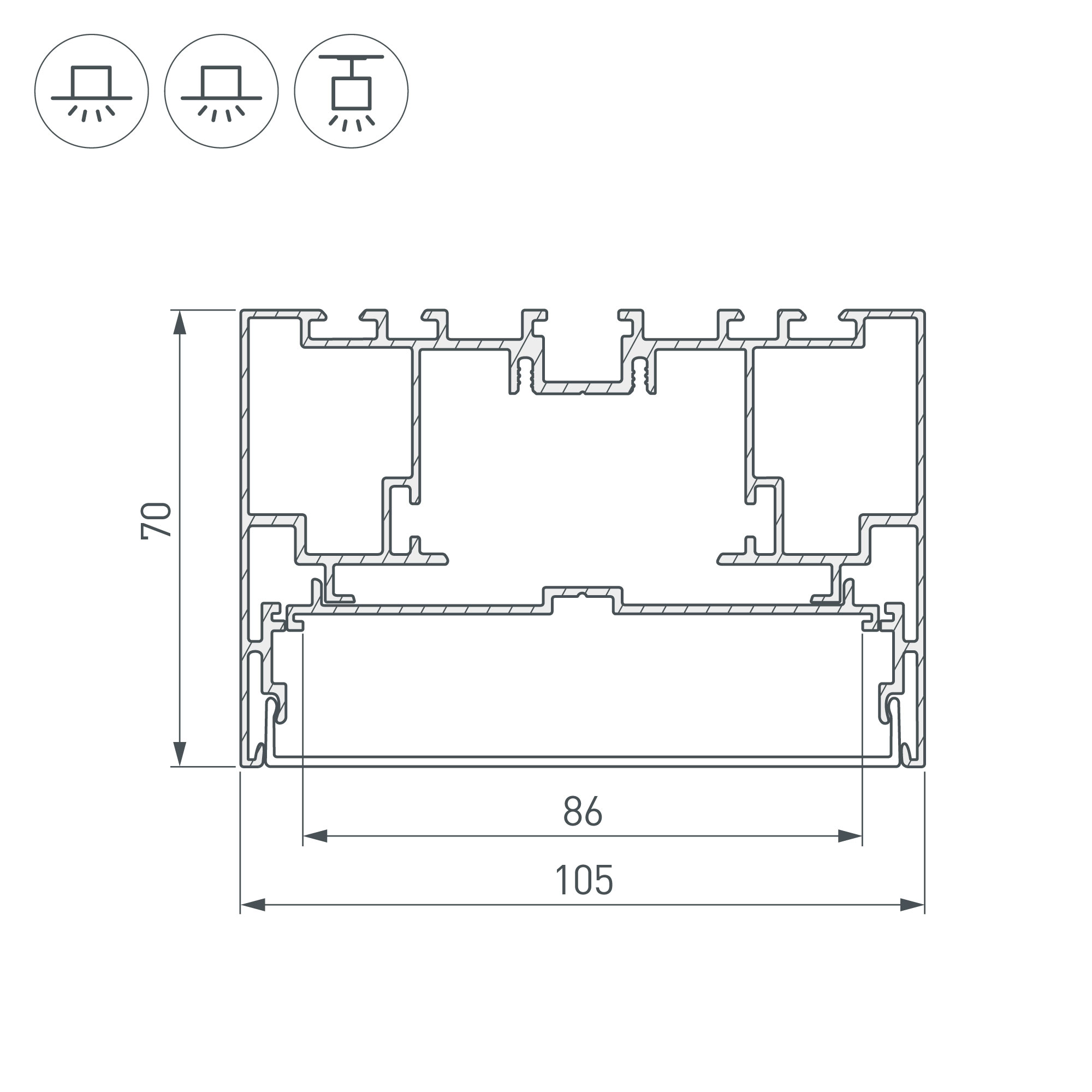 Подвесной/накладной/встраиваемый профиль из анодированного алюминия в комплекте с матовым рассеивателем из поликарбоната со светопропусканием 85% идеально подходит для основного освещения и контурной подсветки. Отсек для блока питания (50х25 мм) и съемная площадка для светодиодной ленты с фиксаторами значительно облегчают сервисное обслуживание осветительного оборудования. Габаритные размеры профиля составляют 2500 мм в длину, 105 мм в ширину и 70 мм в высоту. Площадка для установки светодиодных лент позволяет использовать ленту шириной до 86 мм и мощностью до 91 Вт/м. Это обеспечивает гибкость в выборе светодиодных лент и создает потрясающие световые решения. Заглушки и другие аксессуары не включены в комплект и приобретаются отдельно. Цена указана за комплект. Отличное решение для создания современных световых проектов.