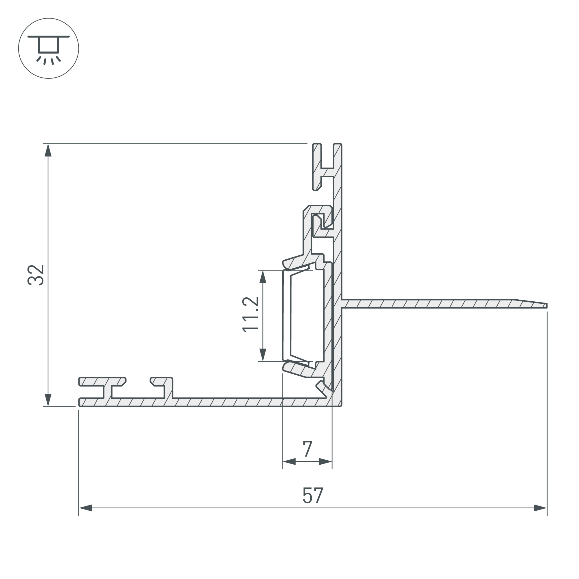 Алюминиевый профиль для светодиодных лент и линеек, для подсветки потолочных ниш. "Тонкий край" под финишную отделку. Возможность выбора направления свечения - параллельно или перпендикулярно плоскости потолка. В комплекте: основание, профиль, силиконовый уплотнительный шнур. Габаритные размеры (L×W×H): 2000x57x32 мм. Ширина площадки для ленты 11 мм. Экраны, заглушки и другие аксессуары приобретаются отдельно. Цена за 1 метр.
