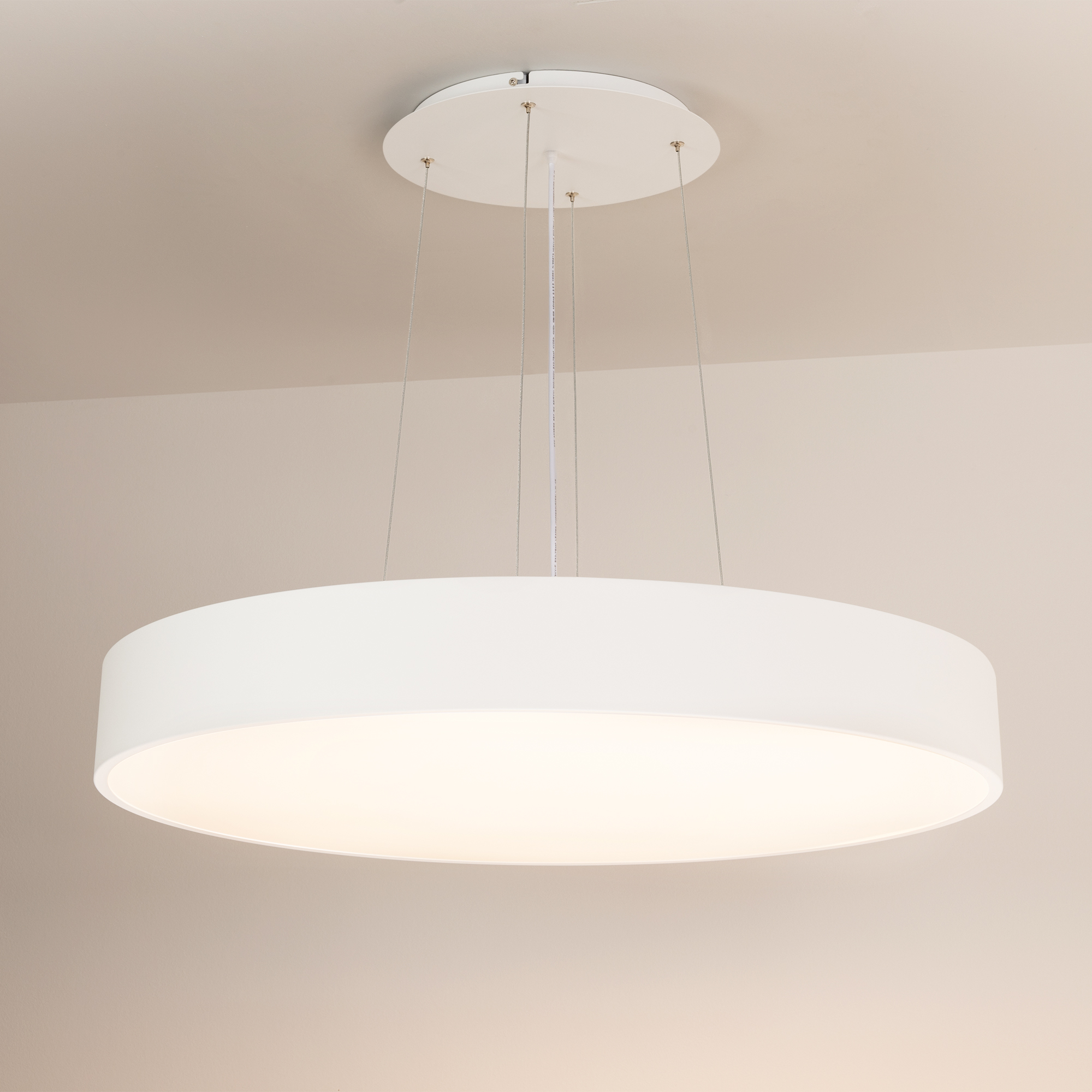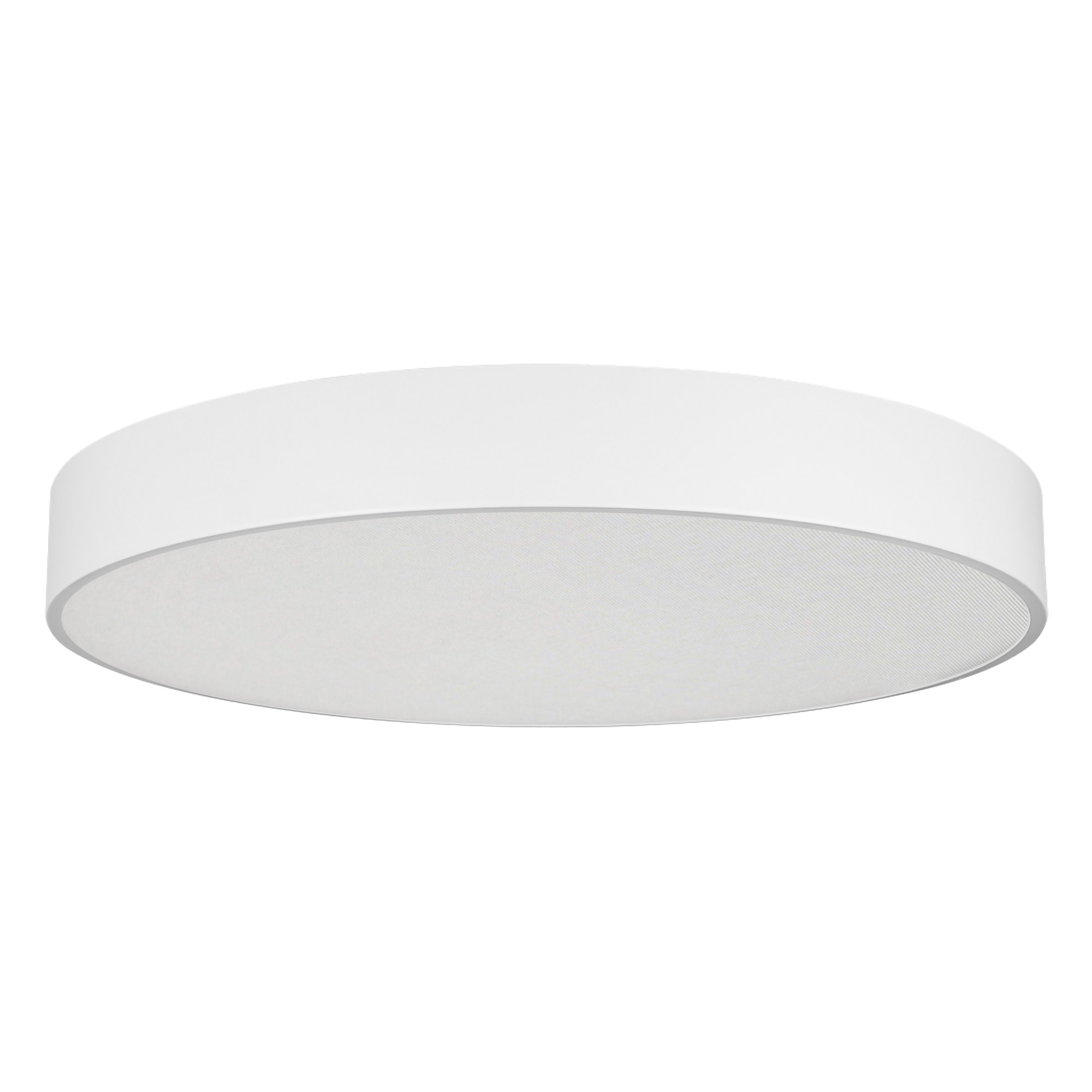 Накладной интерьерный светильник. Мощность 94 Вт, св. поток 7620 лм, 80 лм/Вт, теплый 3000 K, CRI>80, угол 100°, напряжение питания 230 В. Белый круглый корпус из алюминия, степень защиты IP20. Призматический акриловый рассеиватель. Размер: диаметр 800 мм, высота 100 мм. Монтаж накладной. Драйвер 28-42 В, 1200 мА (2 шт.), пульсация <2%.