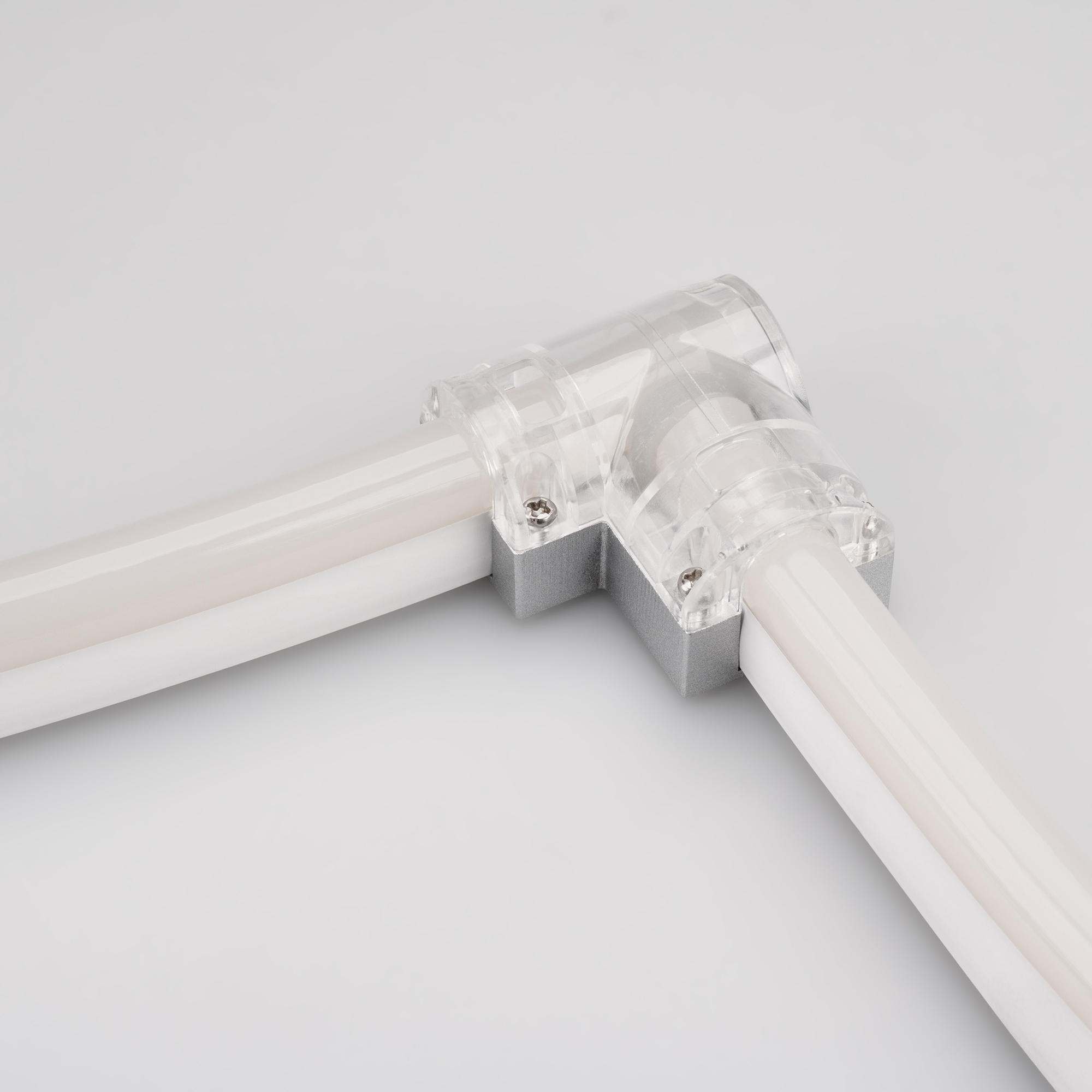 Угловой двухконтактный соединитель подходит для герметичной ленты сечения 26x15 мм из серии NEON. Он обеспечивает непрерывное соединение и создает сплошную линию свечения без разрывов. Для достижения уровня защиты IP65, требуется дополнительная герметизация при соединении. Соединитель изготовлен из алюминия и прозрачного пластика, что придает ему прочность и эстетичный вид. Размеры соединителя составляют 53.5х47.5х29.7 мм.