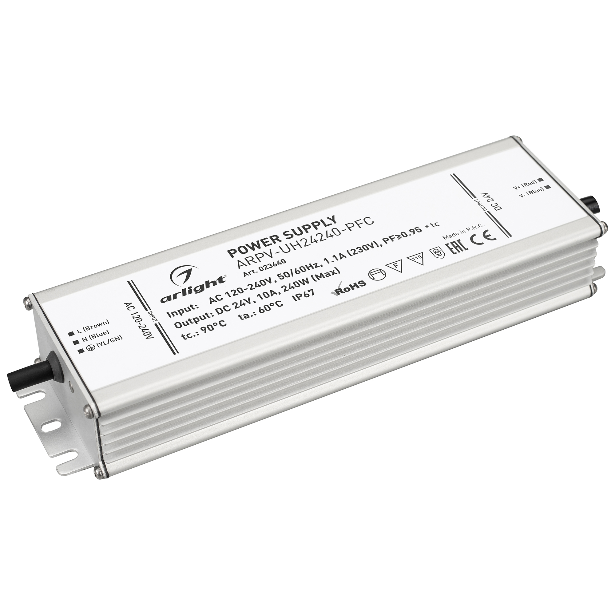Источник напряжения с гальванической развязкой для светодиодных изделий. Входное напряжение 120-240 VAC. Выходные параметры: 24 В, 10 А, 240 Вт. Встроенный PFC >0.95. Герметичный алюминиевый корпус IP 67. Рабочая температура -40…+70C⁰. Габаритные размеры длина 215 мм, ширина 67.5 мм, высота 33.5 мм. Гарантийный срок 7 лет.