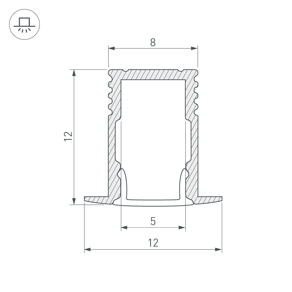 Встраиваемый профиль с накладным фланцем из анодированного алюминия для подсветки мебели, пазов, ниш и других элементов интерьера. Габаритные размеры профиля составляют 2000 мм в длину, 12 мм в ширину и 12 мм в высоту. Площадка для установки светодиодных лент позволяет использовать ленту шириной до 5 мм и мощностью до 11,6 Вт/м. Это обеспечивает гибкость в выборе светодиодных лент и создает потрясающие световые решения.