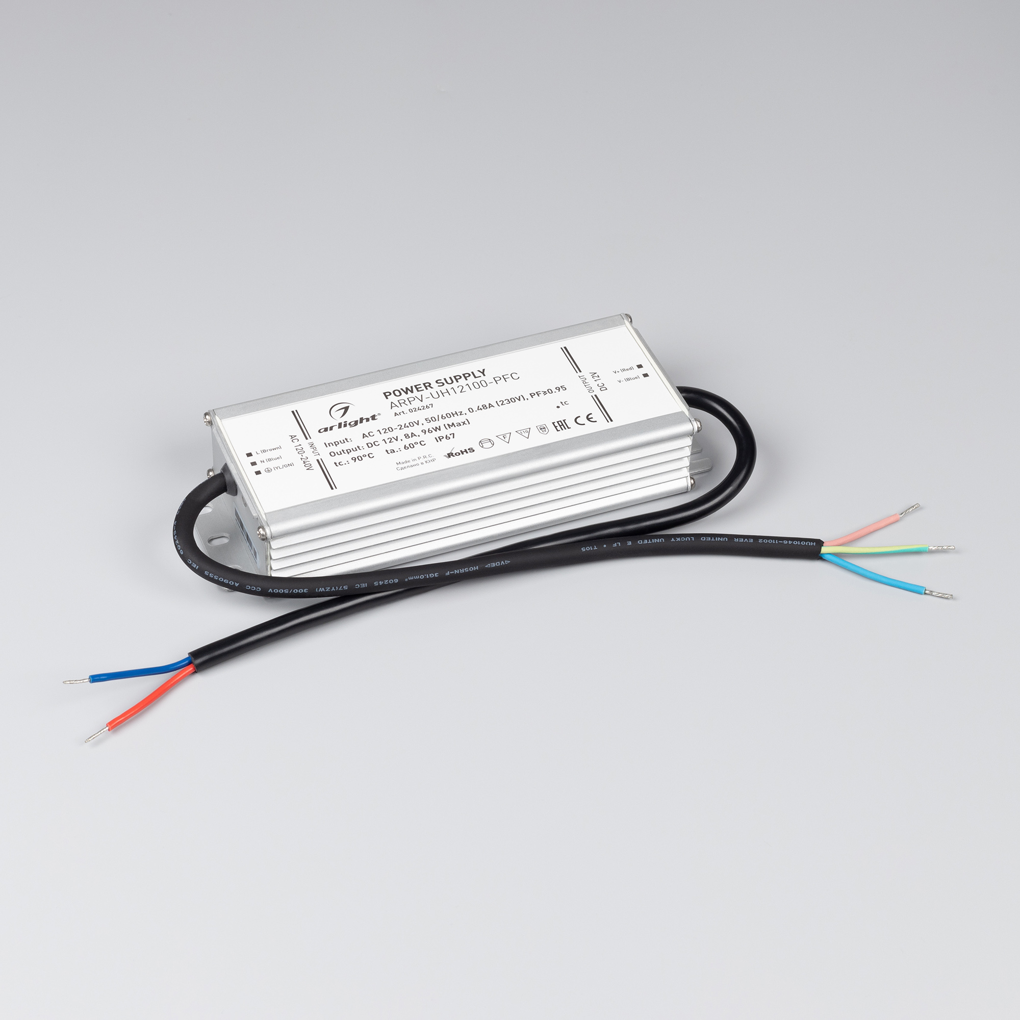 Источник напряжения с гальванической развязкой для светодиодных изделий. Входное напряжение 120-240 VAC. Выходные параметры: 12 В, 8 А, 96 Вт. Встроенный PFC >0,95. Герметичный алюминиевый корпус IP 67. Рабочая температура -40…+60C⁰. Габаритные размеры длина 188 мм, ширина 67.5 мм, высота 33.5 мм. Гарантийный срок 7 лет.
