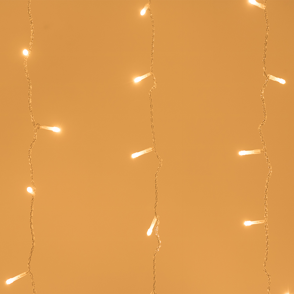 Светодиодный Занавес Home. Размер 1500x1500 мм (длина 1500 мм, высота 1500 мм). 8 ниспадающих нитей длиной 1500 мм. 144 светодиода размером 5 мм. Цвет свечения ТЕПЛЫЙ БЕЛЫЙ (3000 К), постоянное свечение и 8 динамических эффектов с резким световым рисунком (прозрачная вогнутая линза). Провод прозрачный, ПВХ. Питание 230 В, Мощность 6 Вт, защита IP20, применение в помещении. Аксессуар для подключения и выбора режима свечения в комплекте.