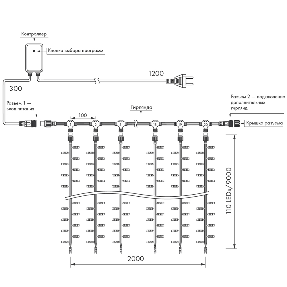 Светодиодный занавес Classic. Размер 2000x9000 мм (длина 2000 мм, высота 9000 мм). 20 ниспадающих нитей длиной 9000 мм. Цвет светодиодов ТЕПЛЫЙ БЕЛЫЙ (3000 К), динамический эффект "водопад". 2200 светодиодов размером 7 мм с резким световым рисунком (прозрачная вогнутая линза). Провод прозрачный, ПВХ. Питание 230 В, Мощность 180 Вт, защита IP65, применение в помещении и на улице под навесом. Аксессуары для подключения в комплекте.