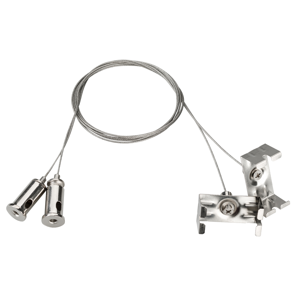 Подвесное крепление для профиля ARH-WIDE-W39. Два регулируемых троса длиной 1 метр с держателями. Используя необходимое количество тросов (в зависимости от формы и длины светильника) можно легко зафиксировать конструкцию на необходимом расстоянии от потолка.