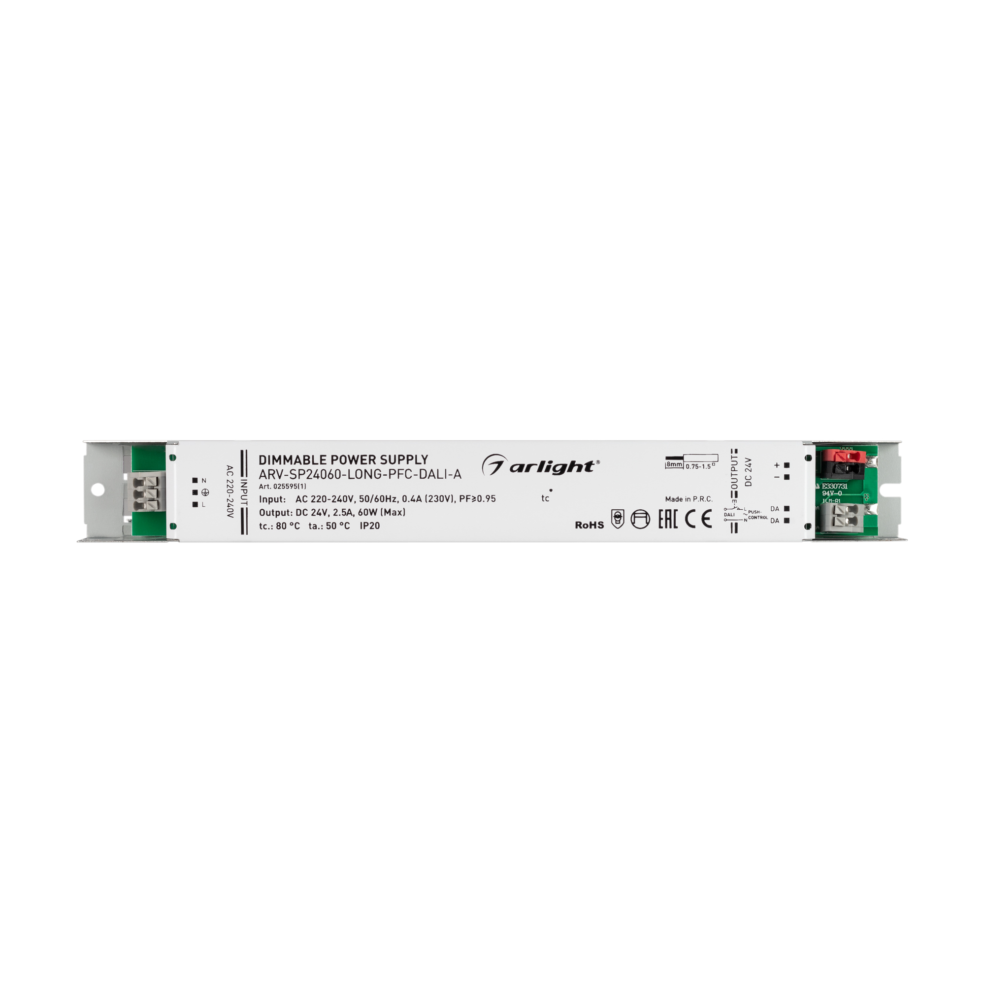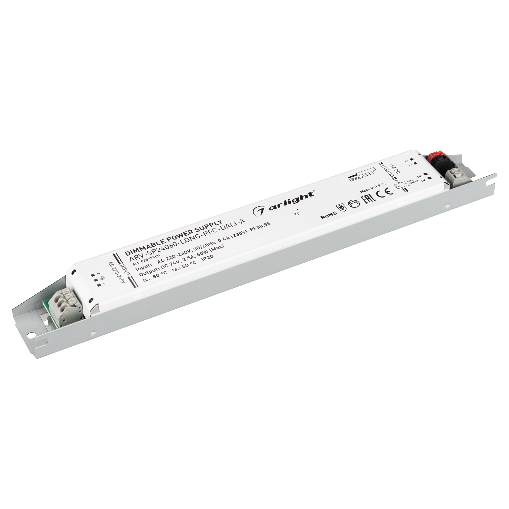 Диммируемый источник напряжения по протоколу DALI с гальванической развязкой для светодиодных изделий. Входное напряжение 220-240 VAC. Выходные параметры: 24 В, 2,5 А, 60 Вт. Встроенный PFC >0,95. Негерметичный алюминиевый корпус IP 20.Габаритные размеры длина 250 мм, ширина 30 мм, высота 21 мм. Гарантийный срок 5 лет.