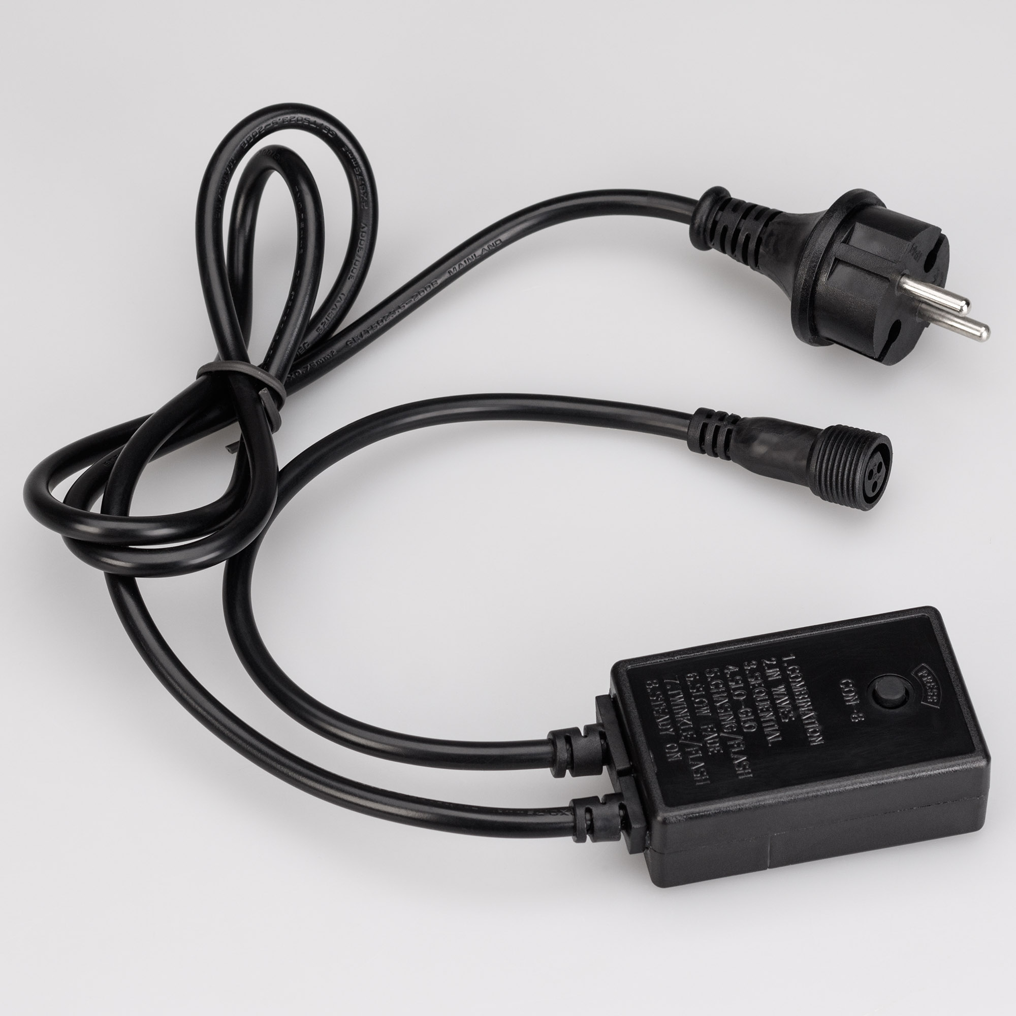 Контроллер предназначен для управления светодиодными гирляндами с эффектом динамики. В комплект входит шнур питания с вилкой европейского стандарта (IP44), 3pin разъем для подключения к гирлянде, выпрямитель AC/DC (1.6А), а также контроллер для смены режимов динамического свечения. Контроллер имеет 8 режимов, которые переключаются по кнопке на корпусе. Оболочка из черного каучука придает ему элегантный внешний вид. Длина провода составляет 1,5 метра, что позволяет удобно располагать гирлянду.