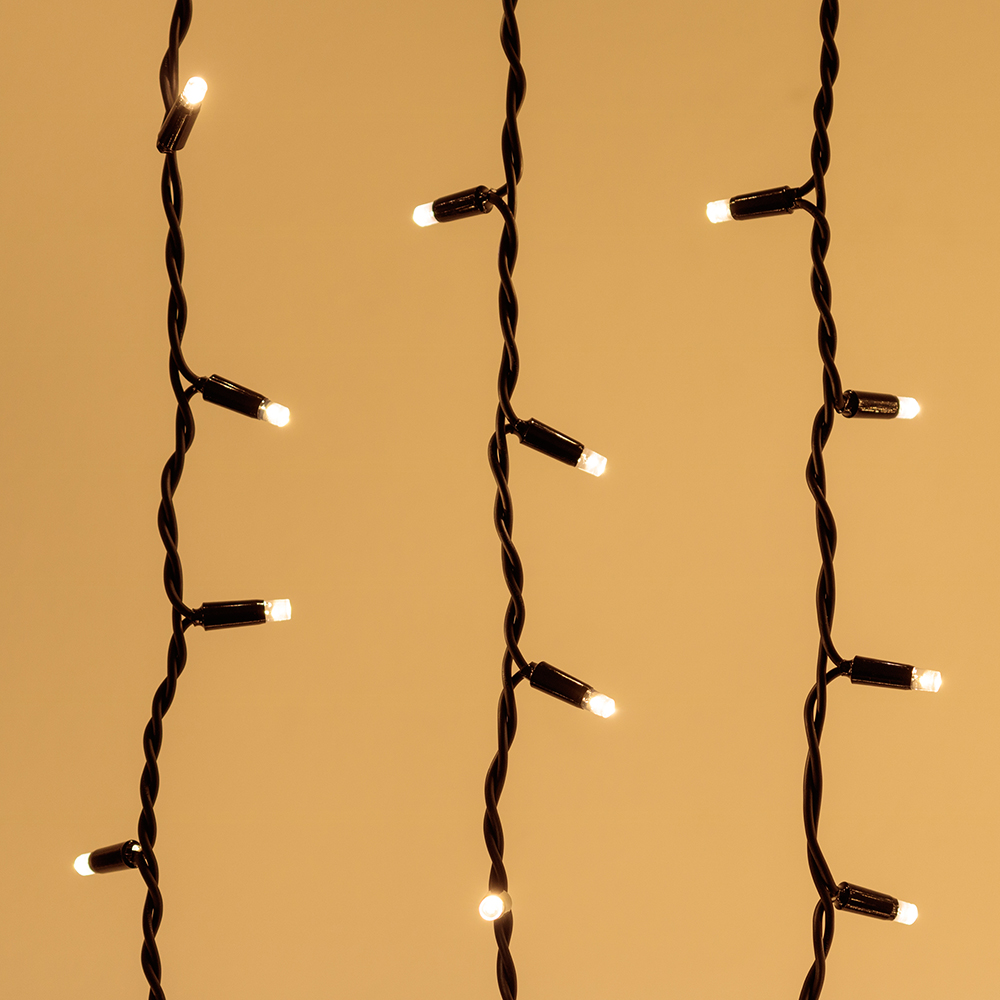 Светодиодный Занавес Pro. Размер 2000x3000 мм (длина 2000 мм, высота 3000 мм). 20 ниспадающих нитей длиной 3000 мм. 760 светодиодов размером 7 мм. Цвет свечения ТЕПЛЫЙ БЕЛЫЙ (3000 К), постоянное свечение и 8 динамических эффектов с резким световым рисунком (прозрачная вогнутая линза). Провод черный, каучук. Питание 230 В, Мощность 70 Вт, защита IP65, применение в помещении и на улице под навесом. Аксессуар для подключения и выбора режима свечения в комплекте.