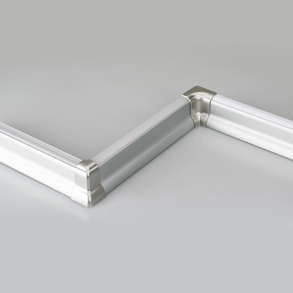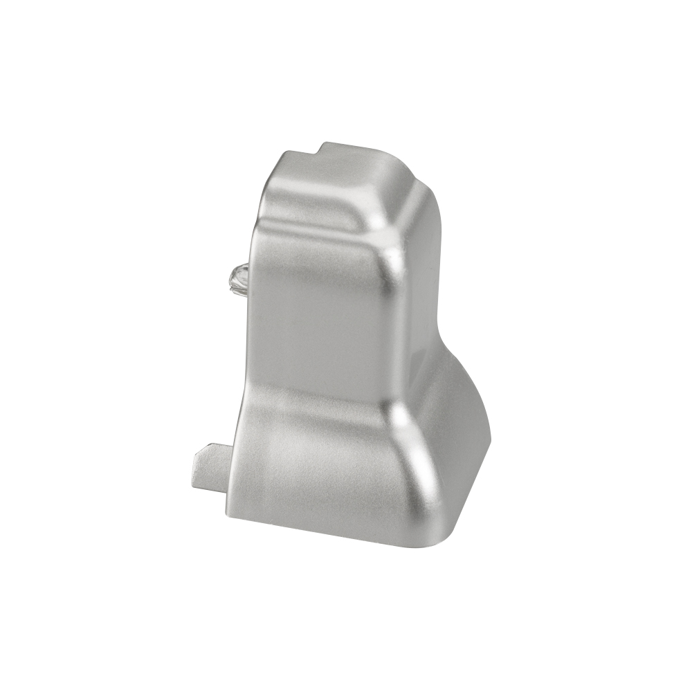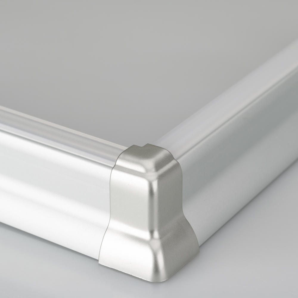 Серебристый угловой пластиковый соединитель (внешний) для профиля ARH-PLINTUS. Применяется для соединения двух отрезков профиля под углом 90°.