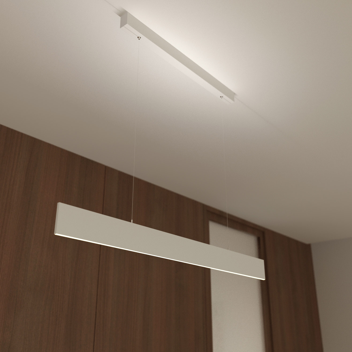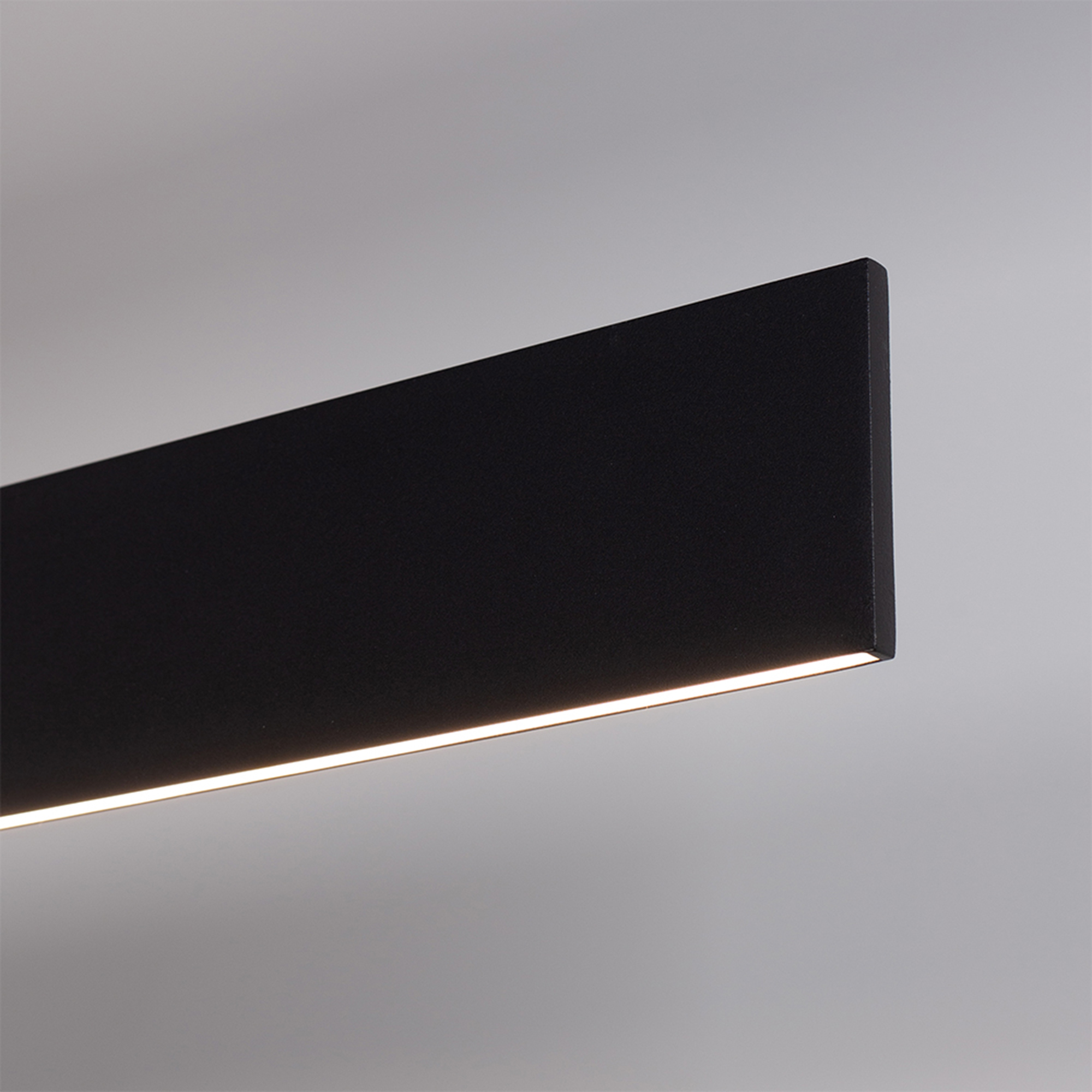 Подвесной линейный светильник 30Вт. Цвет ТЕПЛЫЙ 3000K, св.поток 1800лм, CRI>90, угол 110°+110°. Корпус из черного алюминия. Размер LxWxH 1004x8x80мм. Длина подвеса 500-1500мм. Питание AC 220-240V, 30Вт, драйвер встроенный (DC700mA, 33-40V).