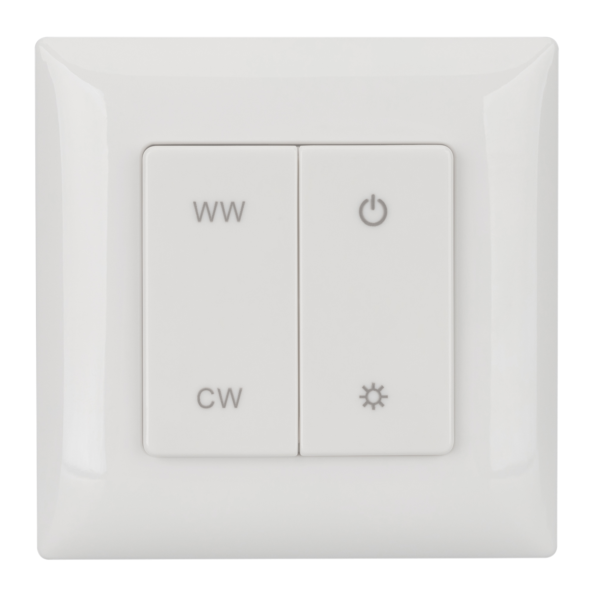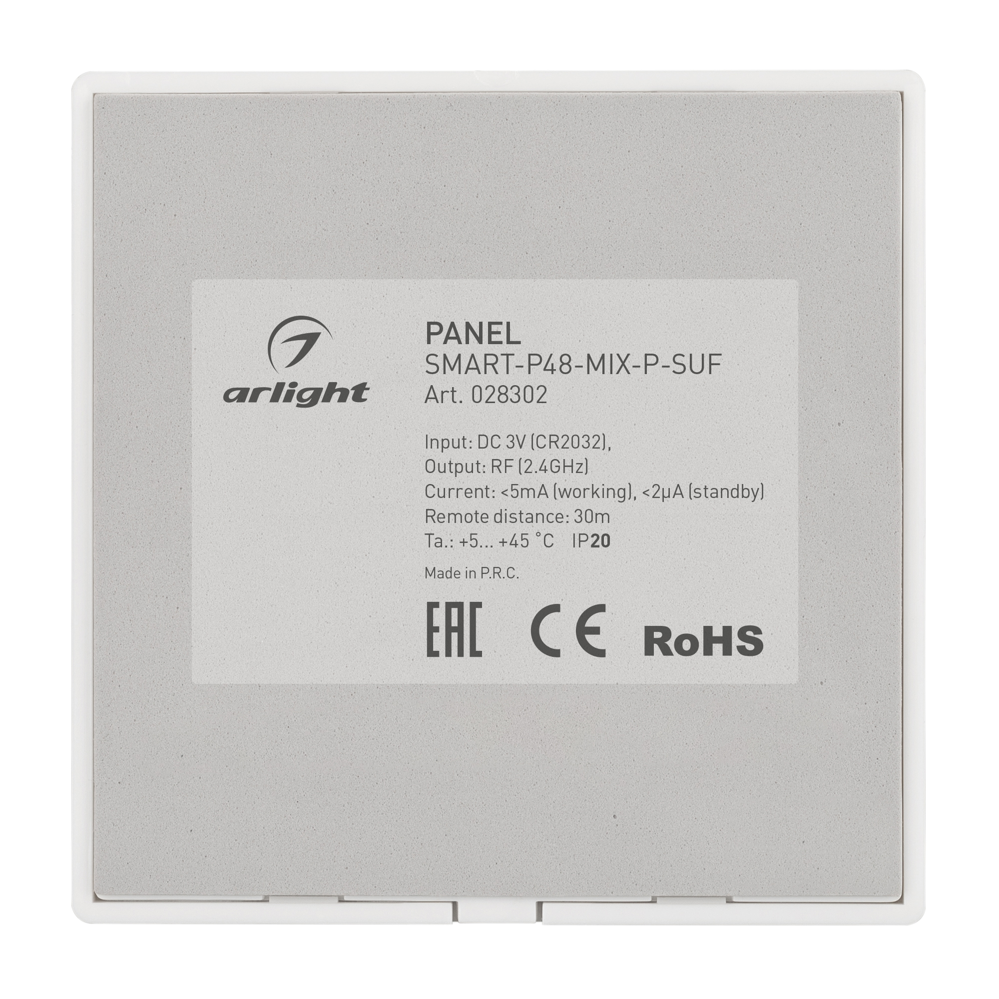 Накладная кнопочная панель белого цвета, изготовленная из пластика. Предназначена для управления мультибелыми (MIX) источниками света (ШИМ) с помощью кнопок. Основные выполняемые функции: включение и выключение света, регулировка яркости, изменение цветовой температуры. Удобное и точное управление с помощью эргономичных кнопок. Изделие применяется в качестве однозонного пульта дистанционного управления диммерами и контроллерами серии SMART. К одной панели возможно привязать неограниченное количество диммеров и контроллеров. Устройство совместимо с диммерами и контроллерами серии SMART, поддерживающими управление по радиоканалу 2.4G. Питание 3В осуществляется от батарейки CR2032. Габариты панели 86х86х14 мм, корпус выполнен из пластика, лицевая часть - из пластика. Устройство устанавливается на любую поверхность, к которой возможно прикрутить монтажную базу панели.