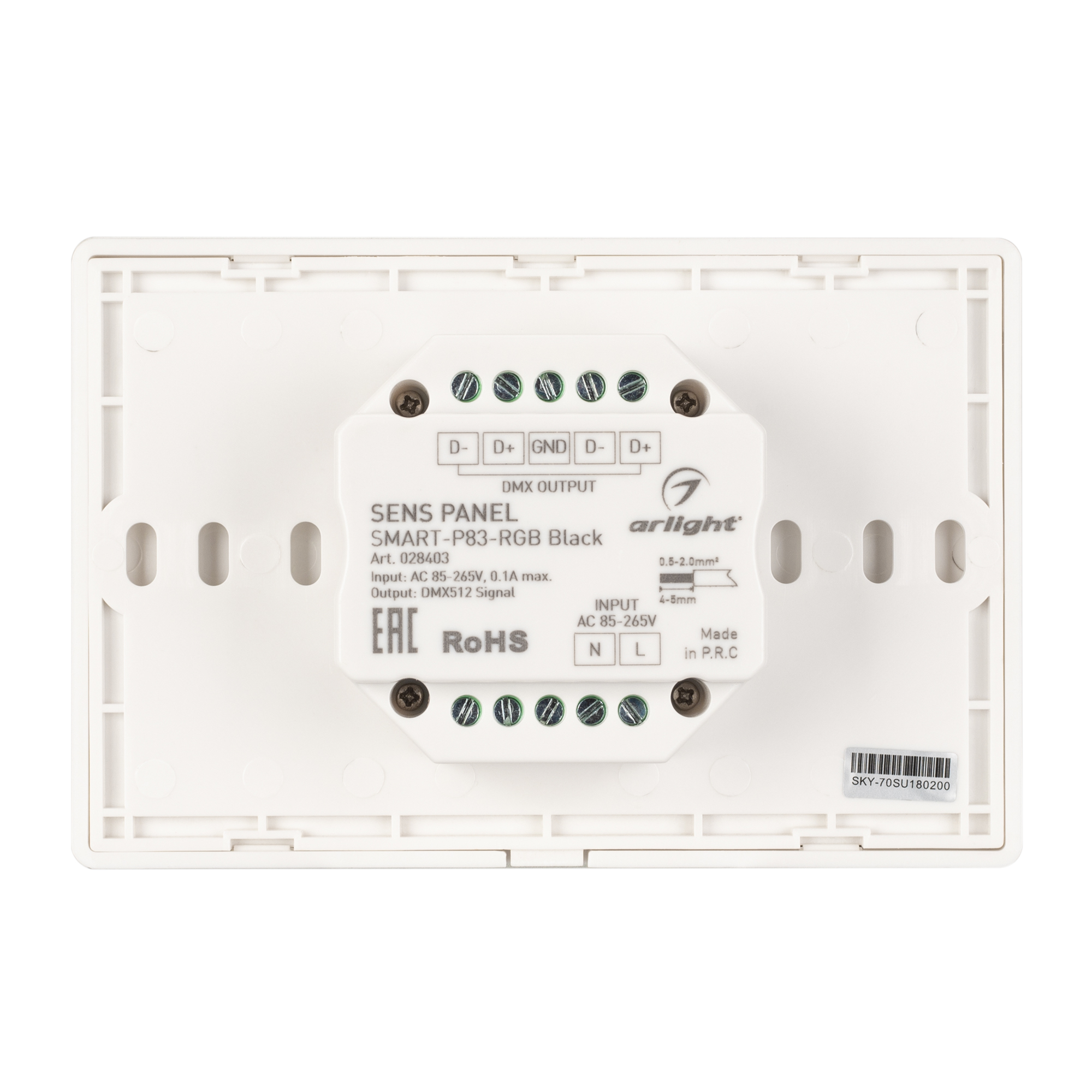 Встраиваемая сенсорная панель в "итальянском" стиле, изготовленная из высококачественного стекла, защищенного от появления царапин. Изделие позволяет осуществлять основные функции управления светом: включение/выключение, регулировка яркости, управление цветом (RGB), сохранение предустановок для 4 световых зон. Панель совместима с диммерами и контроллерами SMART по радиоканалу 2.4G (количество привязываемых диммеров и контроллеров не ограничено) и может управлять DMX-диммерами по проводной шине DMX512. Выходной сигнал DMX соответствует стандартному протоколу DMX512 и совместим с оборудованием DMX любого производителя. Панель чёрного цвета, питание от сети 230В. Габариты устройства 120х80х37 мм, встраивается в стандартную монтажную коробку.