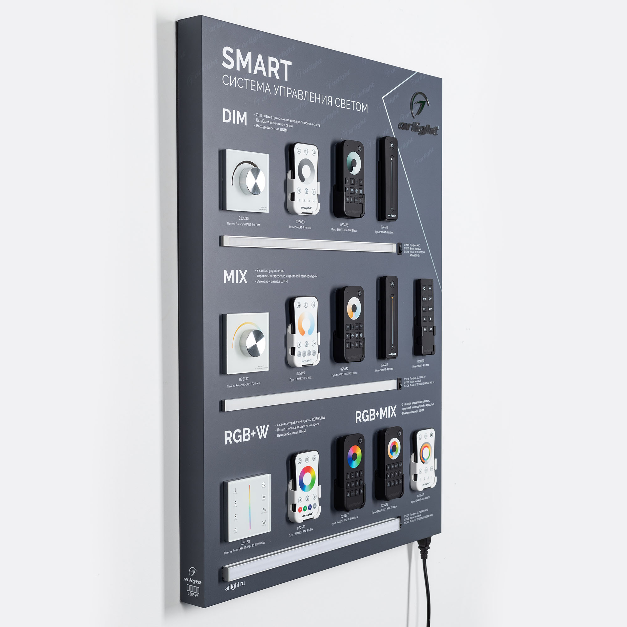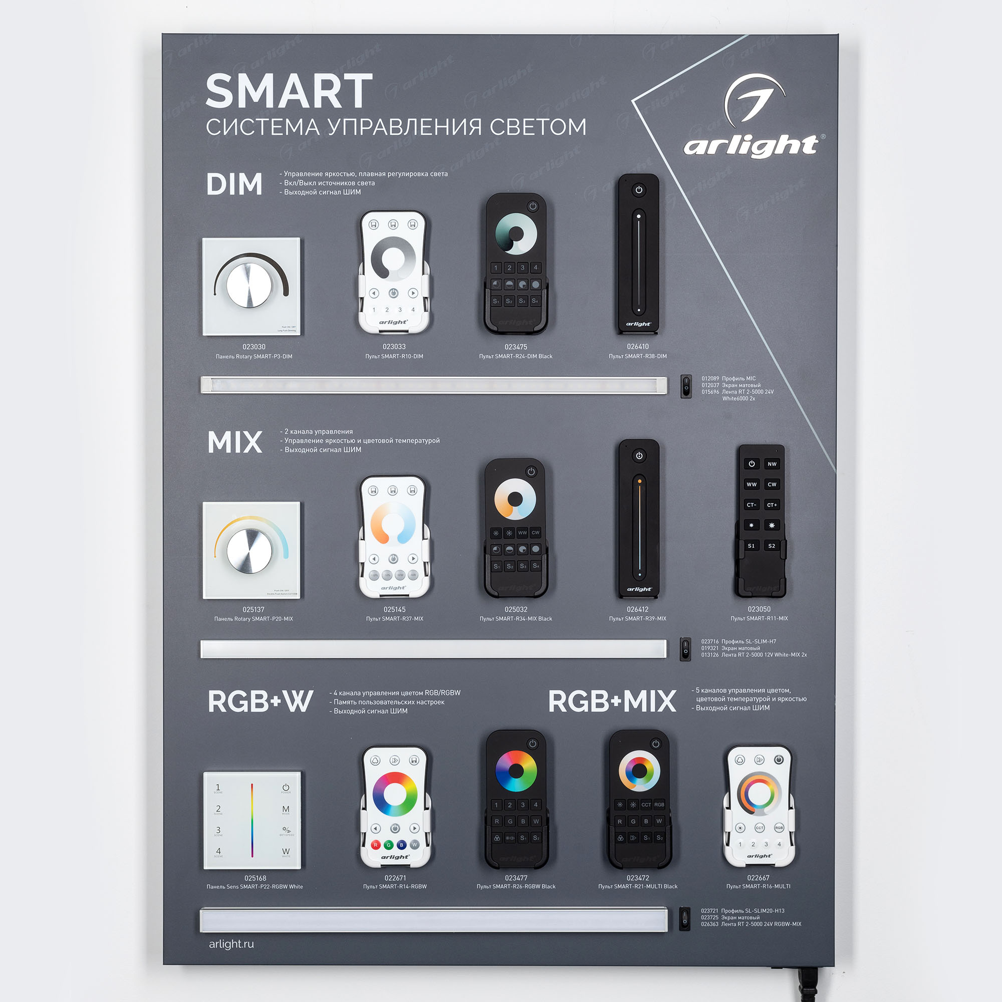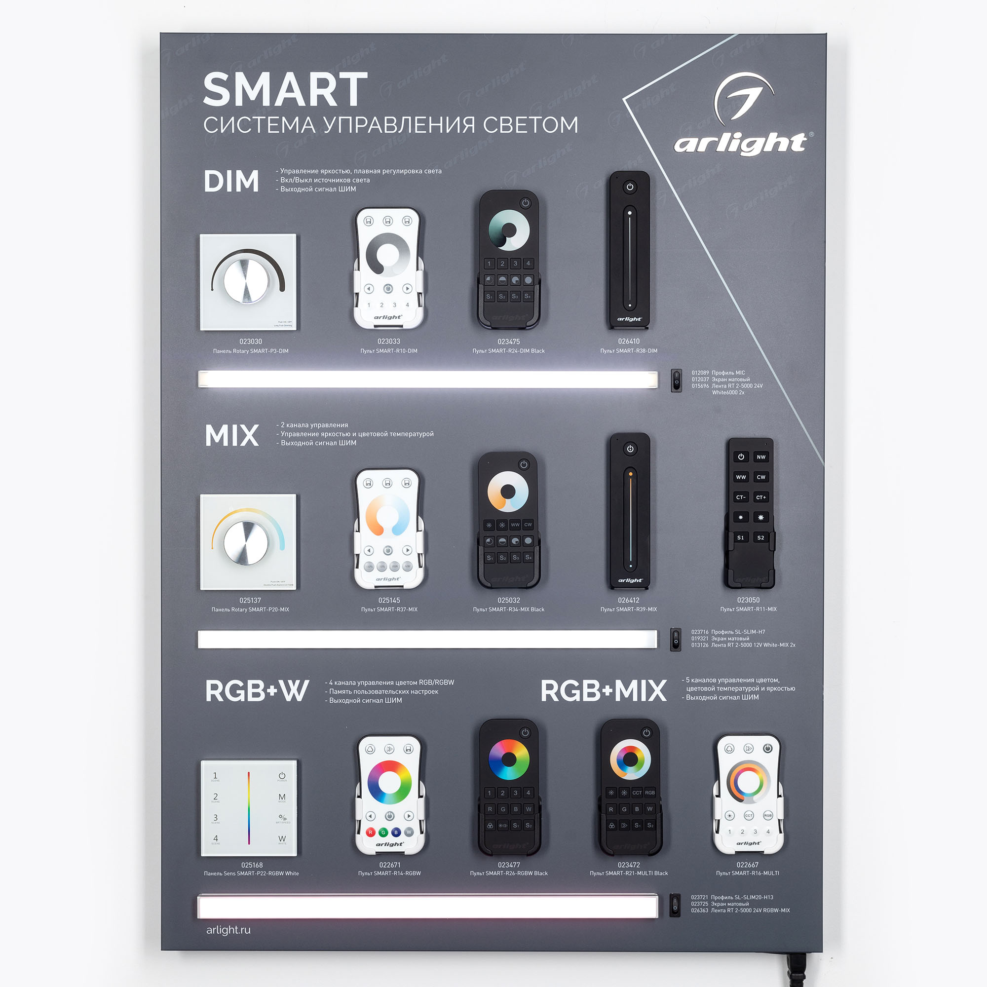 На стенде представлено управление светодиодными лентами DIM, Mix, RGB, RGBW, RGB+MIX с помощью устройств серии SMART.