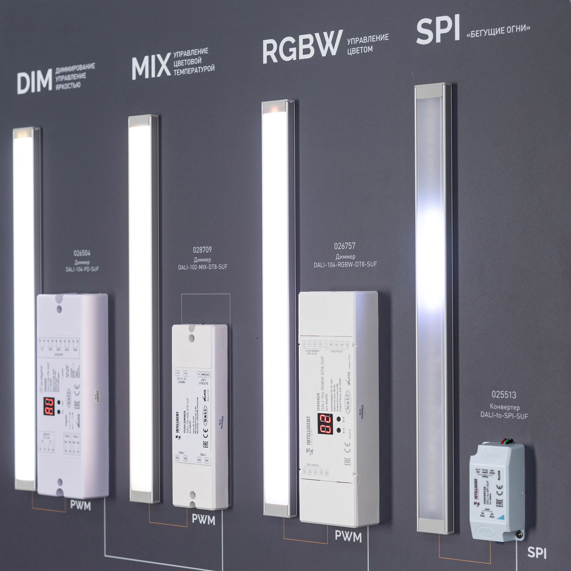 На стенде представлены основные типы устройств для управления освещением по протоколу DALI, возможности интеграции с прочими аналоговыми и цифровыми протоколами / системами управления.