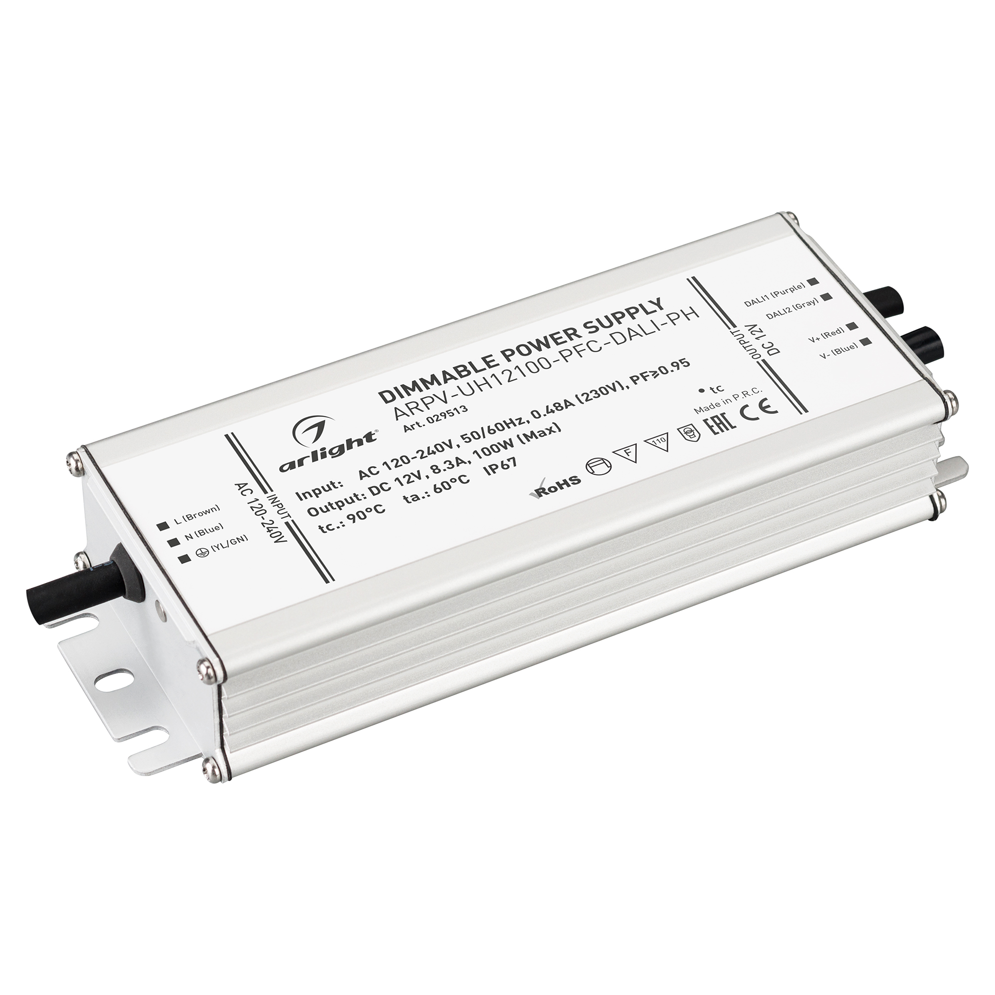 Диммируемый источник напряжения по протоколу DALI с гальванической развязкой для светодиодных изделий. Входное напряжение 120-240 VAC. Выходные параметры: 12 В, 8.3 А, 100 Вт. Встроенный PFC >0.95. Герметичный алюминиевый корпус IP 67. Рабочая температура -40…+70C⁰. Габаритные размеры длина 188 мм, ширина 67.5 мм, высота 33.5 мм. Гарантийный срок 7 лет.