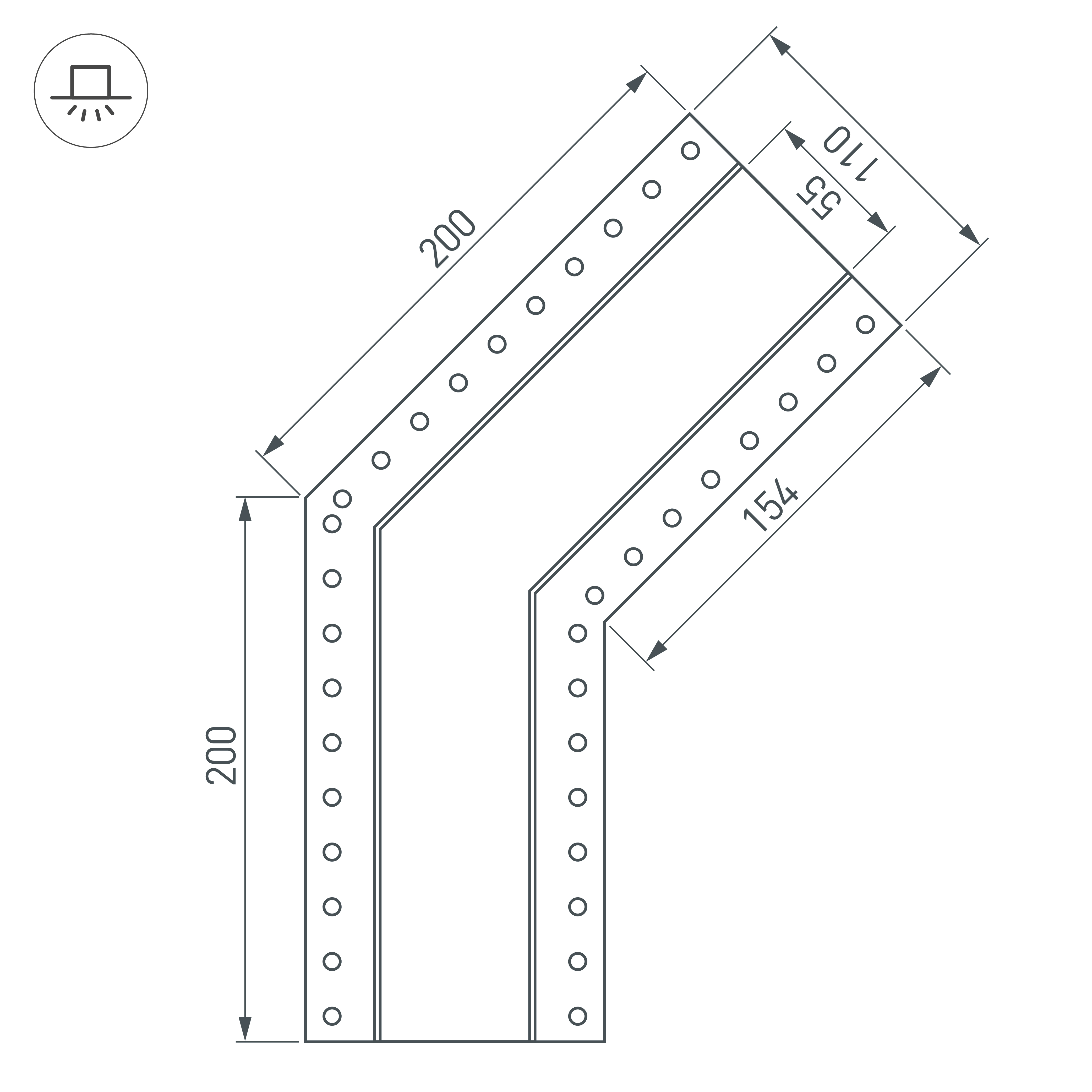 Угол в сборе со скрытым фланцем под строительную отделку для соединения двух профилей SL-LINIA55-FANTOM под углом 135° в одной плоскости в комплекте с матовым экраном и соединителями. Экран образует линию на плоскости. Применятся при изготовлении светильников сложной геометрии.