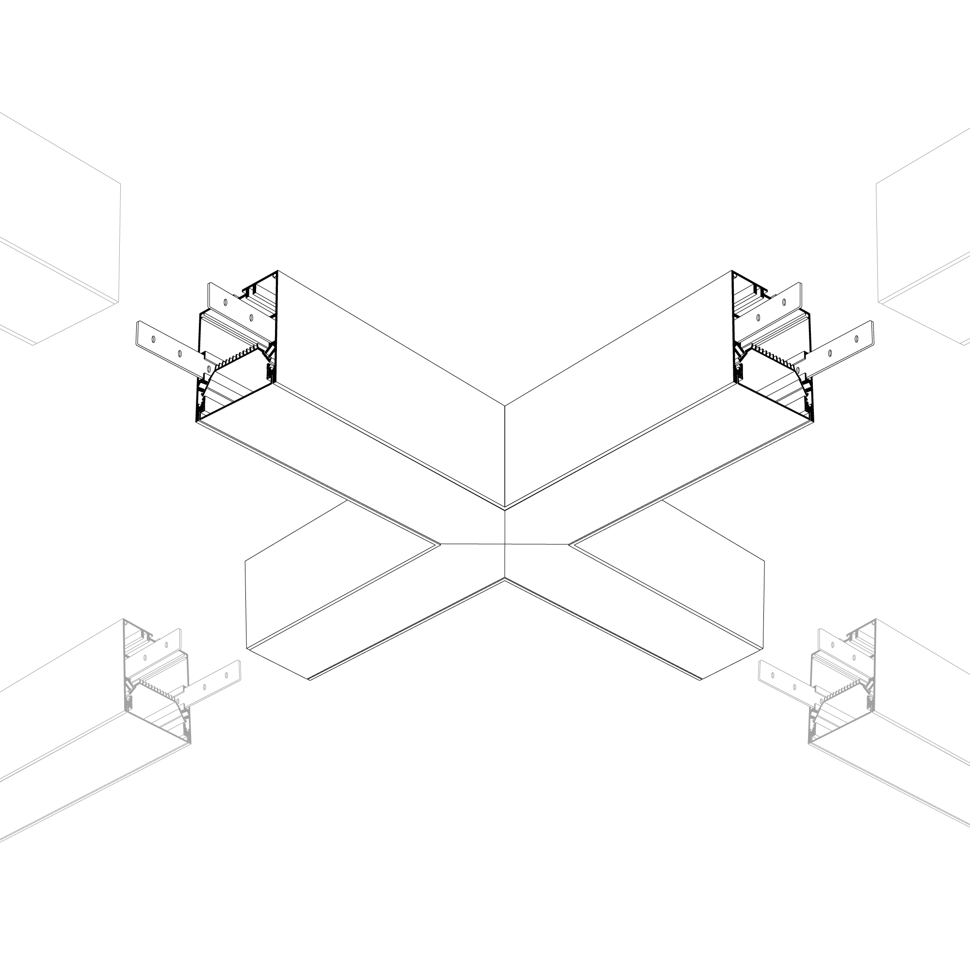 Крестовой угол в сборе для соединения четырех профилей SL-LINE-6070 под прямыми углами 90° в одной плоскости в комплекте с матовым экраном, соединителями и винтами. Экран образует Х-образную фигуру на плоскости. Применятся при изготовлении светильников сложной геометрии. Длина крестовины 400 мм. Цена за комплект.