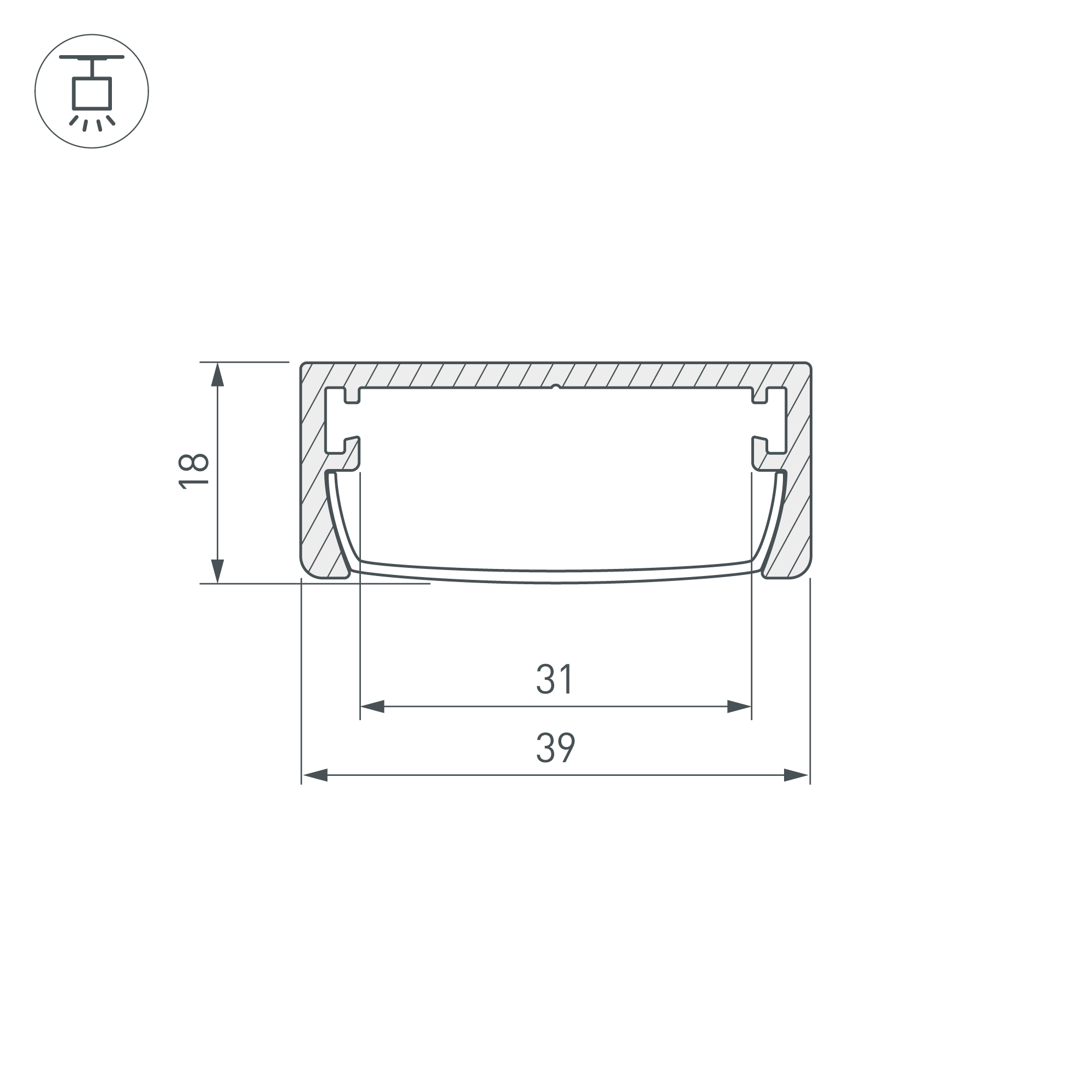 Алюминиевый анодированный накладной/подвесной профиль для светодиодных лент и линеек. Габаритные размеры (L×W×H): 2000x39x18 мм. Ширина площадки для ленты 31 мм. Экраны, заглушки и другие аксессуары приобретаются отдельно. Цена за 1 метр.
