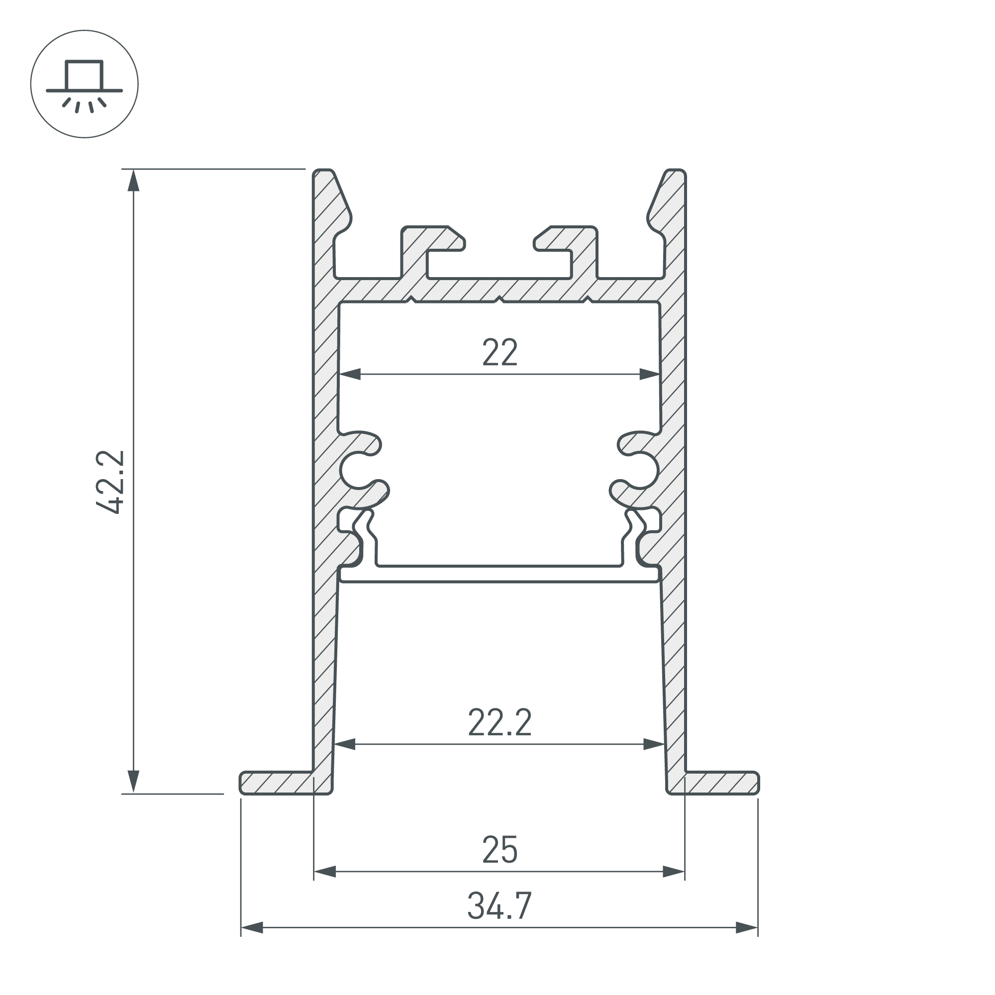 Встраиваемый профиль с накладным фланцем из анодированного алюминия для основной и контурной подсветки помещений. Экран утоплен в плоскости профиля, что позволяет скрыть источник света от прямого контакта с глазами. Габаритные размеры профиля составляют 2000 мм в длину, 34,7мм в ширину и 42,2 мм в высоту, паз для установки 25 мм. Площадка для установки светодиодных лент позволяет использовать ленту шириной до 22 мм и мощностью до 37,5 Вт/м. Это обеспечивает гибкость в выборе светодиодных лент и создает потрясающие световые решения. Экраны, заглушки и другие аксессуары не включены в комплект и приобретаются отдельно. Цена указана за 1 метр профиля. Отличное решение для создания современных световых проектов.