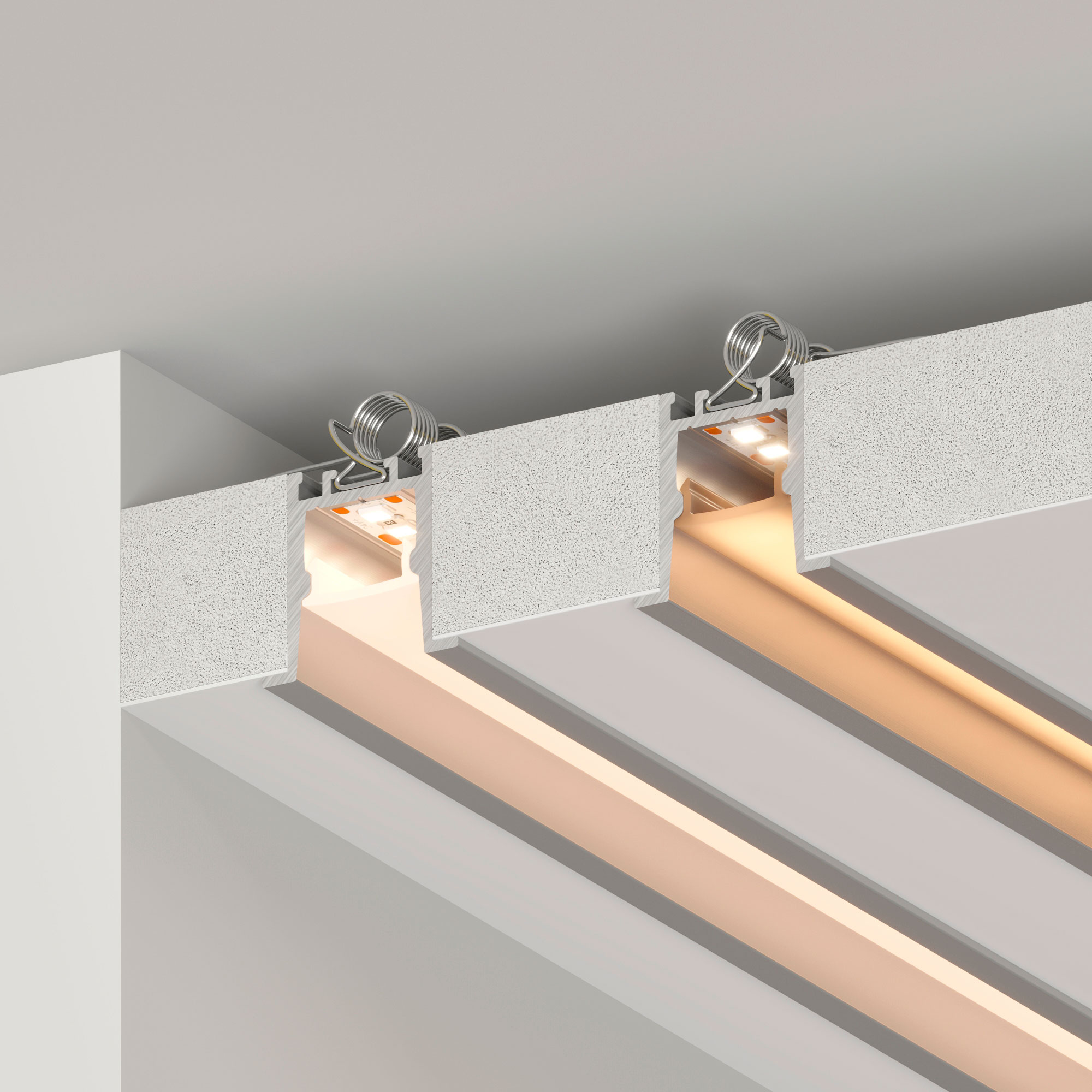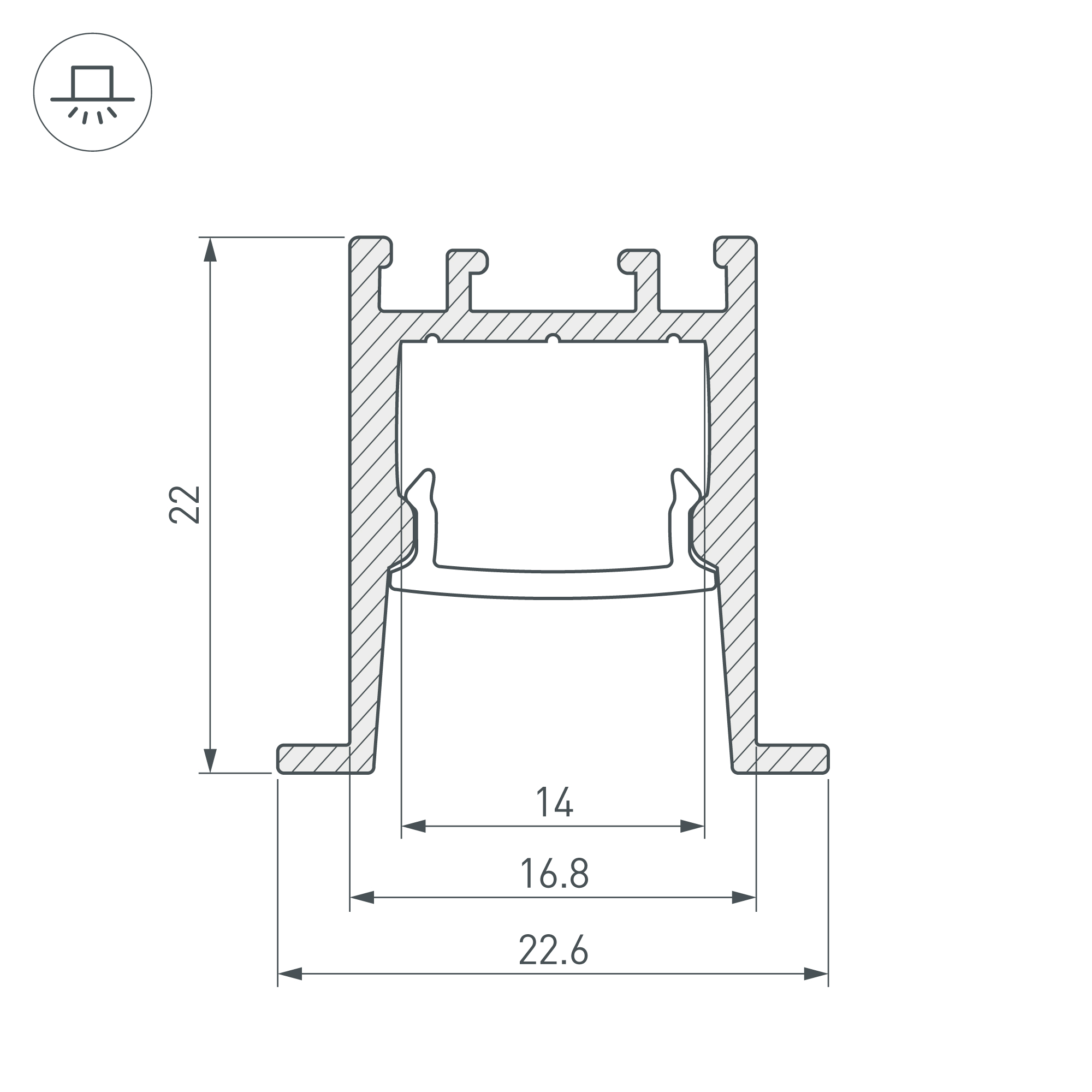 Встраиваемый профиль с накладным фланцем из анодированного алюминия для контурной подсветки интерьера. Экран утапливается в плоскости профиля, что позволяет скрыть источник света от прямого контакта с глазами и сделать освещение более комфортным. Габаритные размеры профиля составляют 2000 мм в длину, 23 мм в ширину и 22 мм в высоту. Площадка для установки светодиодных лент позволяет использовать ленту шириной до 14 мм и мощностью до 22 Вт/м. Это обеспечивает гибкость в выборе светодиодных лент и создает потрясающие световые решения.