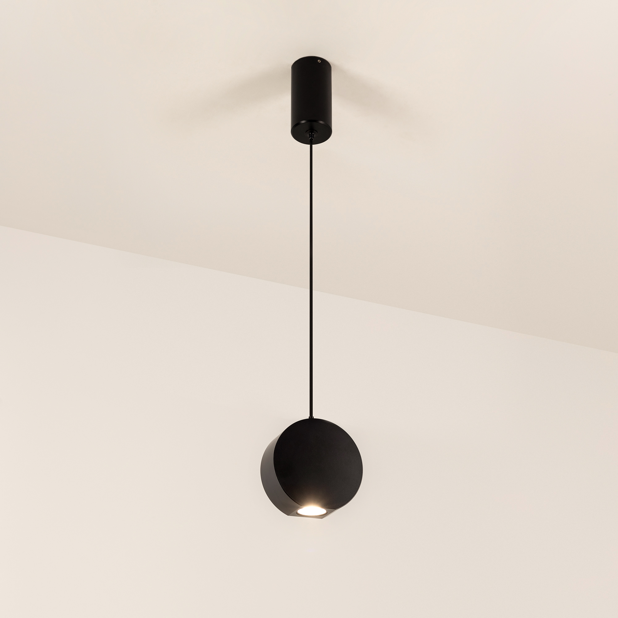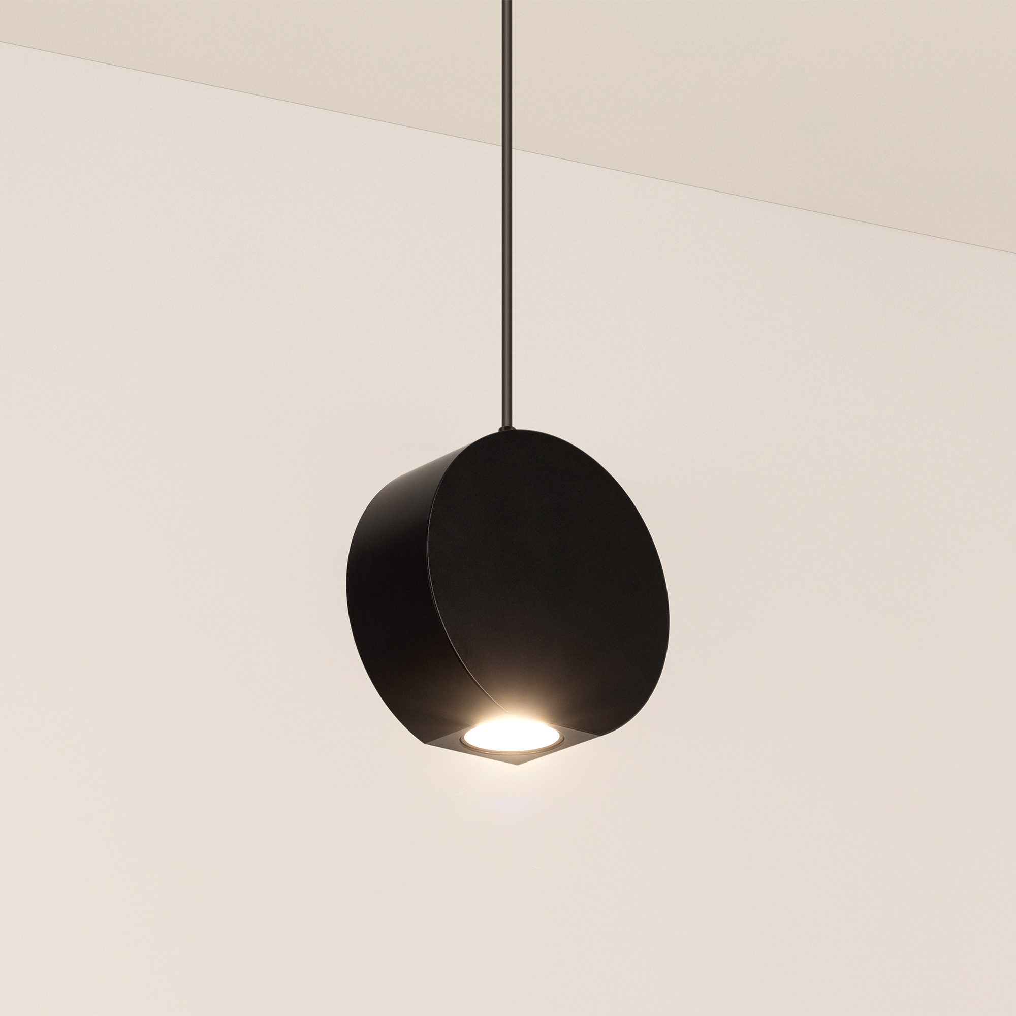Подвесной светильник. Мощность 9 Вт, св. поток 650 лм, 73 лм/Вт, теплый 3000 K, CRI>80, угол 39°, напряжение питания 230 В. Черный круглый корпус из алюминия, экран , степень защиты IP40. Размер: диаметр 100 мм, высота 97 мм, ширина 40 мм. Монтаж подвесной, длина подвеса 1500мм, регулируемая. Габариты чаши Ø50x95 мм. Драйвер 28-42 В, 250 мА, пульсация <5%.