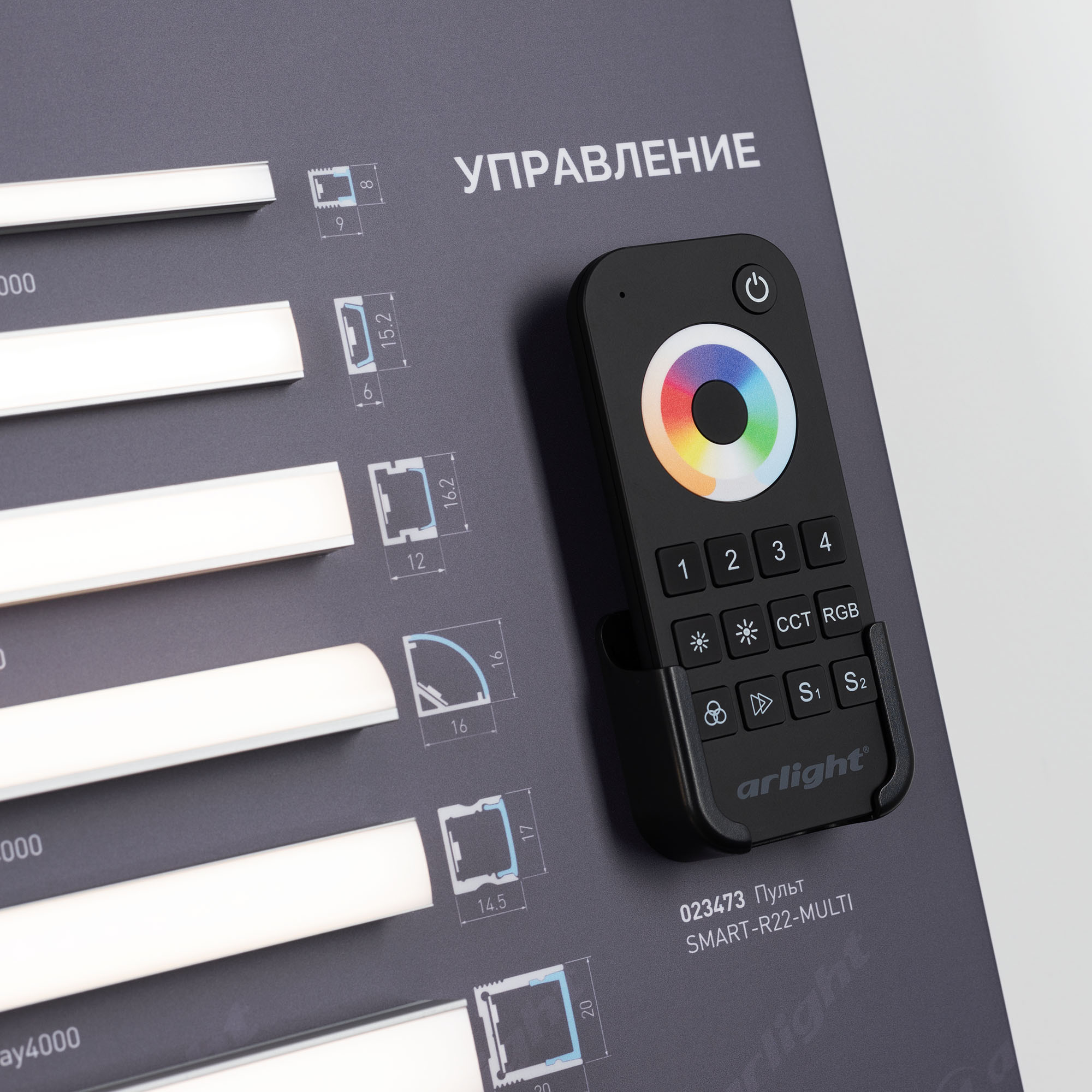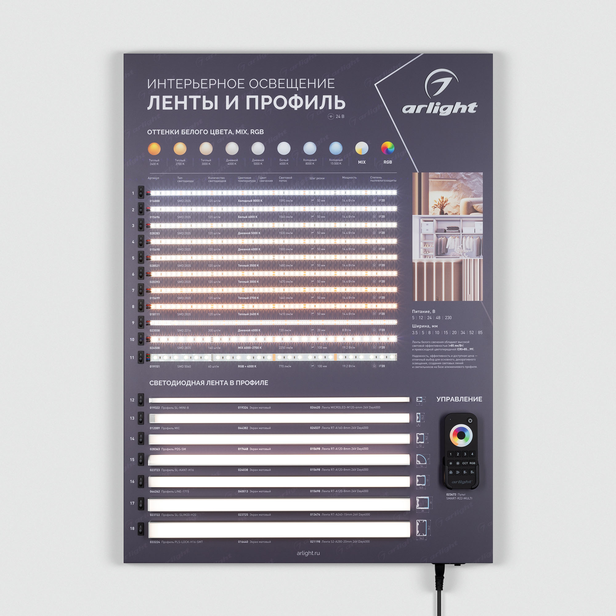 Обзорный мини-стенд по ассортименту светодиодных лент и их применению совместно с накладным профилем для декоративного и основного освещения.