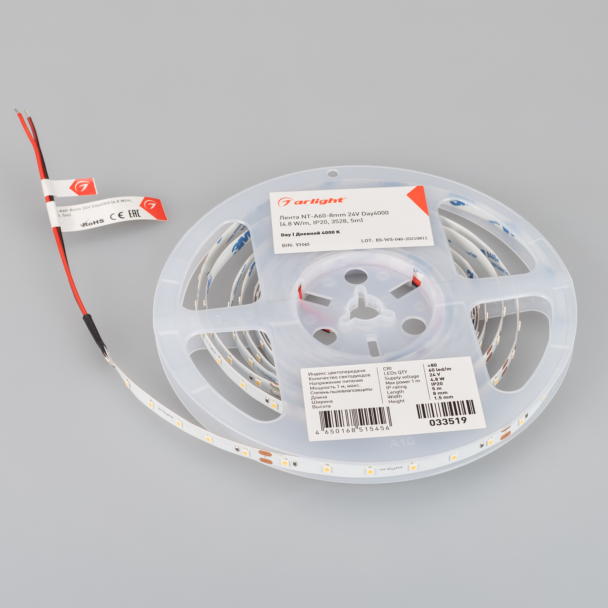 Светодиодная лента NT-A60-8mm 24V Day4000 (4.8 W/m, IP20, 3528, 5m) (Arlight, Открытый)