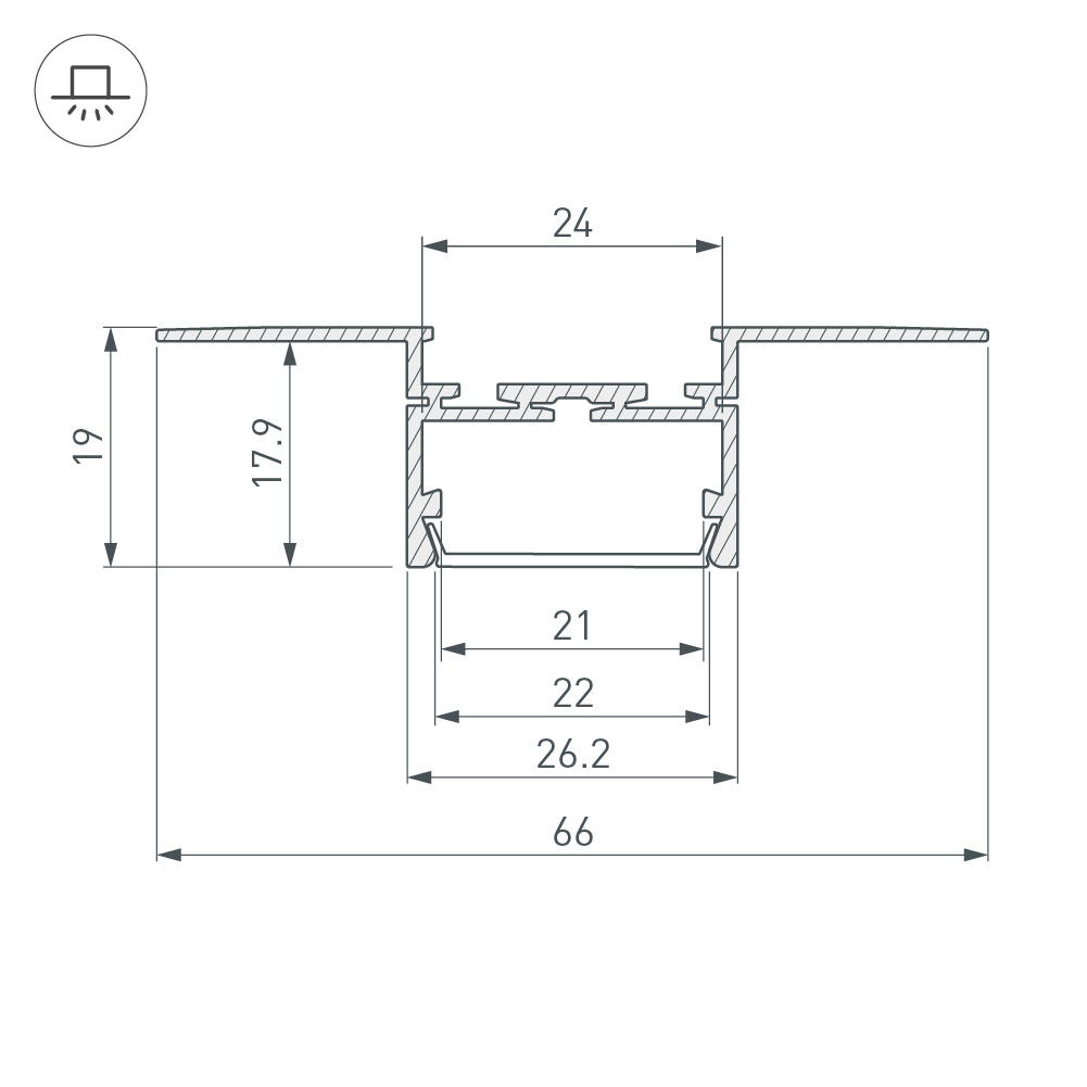 Алюминиевый профиль для светодиодных лент и линеек, встраиваемый в гипсокартон толщиной 16 мм, под строительную отделку. Позволяет создать линию света шириной 22 мм. без видимых частей алюминия. Монтируется между двумя листами гипсокартона. Габаритные размеры (L×W×H): 2000x66x19 мм. Ширина площадки для ленты 24 мм. Экраны, заглушки и другие аксессуары приобретаются отдельно. Цена за 1 метр.
