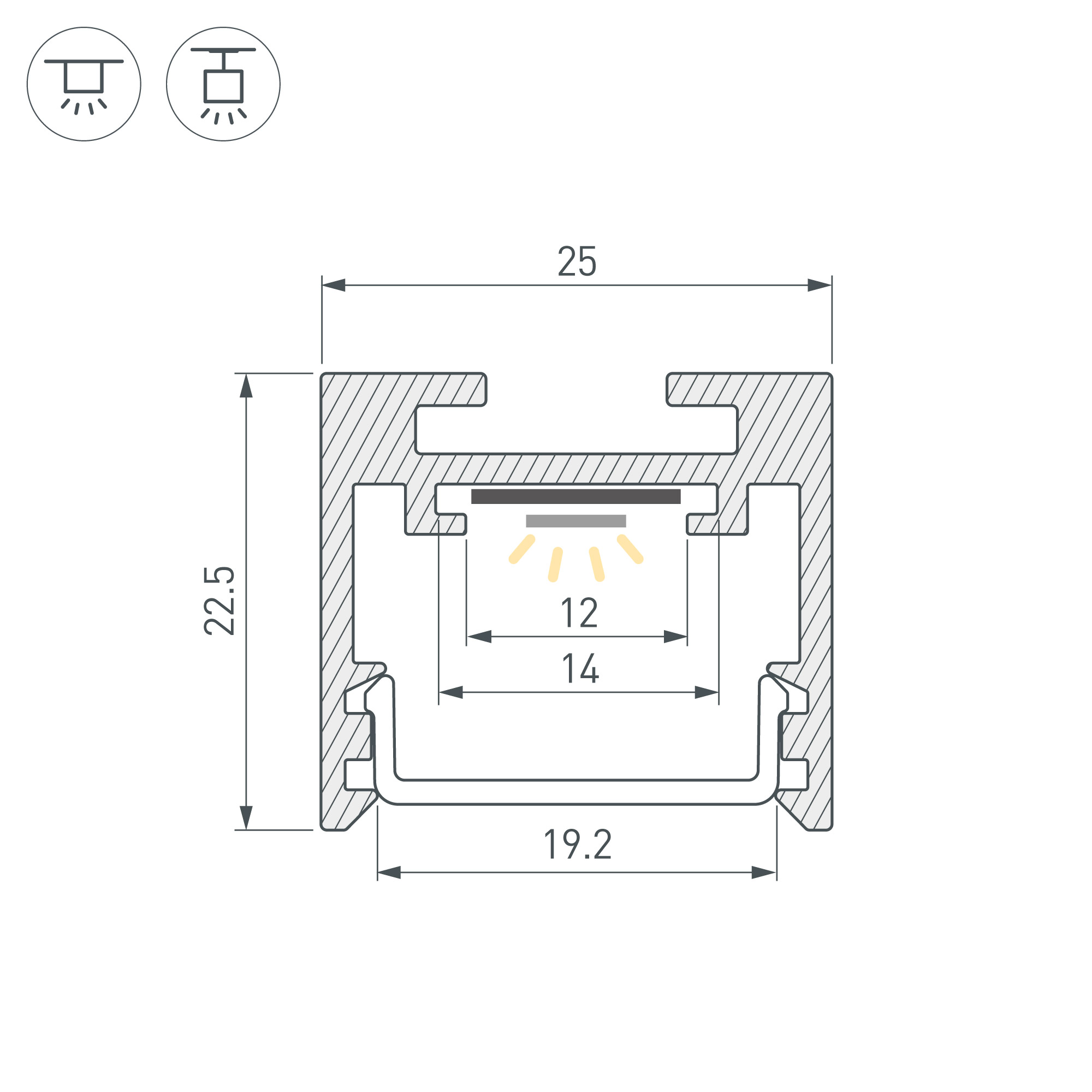 Габаритные размеры профиля составляют 2500 мм в длину, 25,4 мм в ширину и 22,7 мм в высоту. Площадки для установки светодиодных лент позволяют использовать ленты шириной до 12 мм и мощностью до 25 Вт/м. Это обеспечивает гибкость в выборе светодиодных лент и создает потрясающие световые решения.