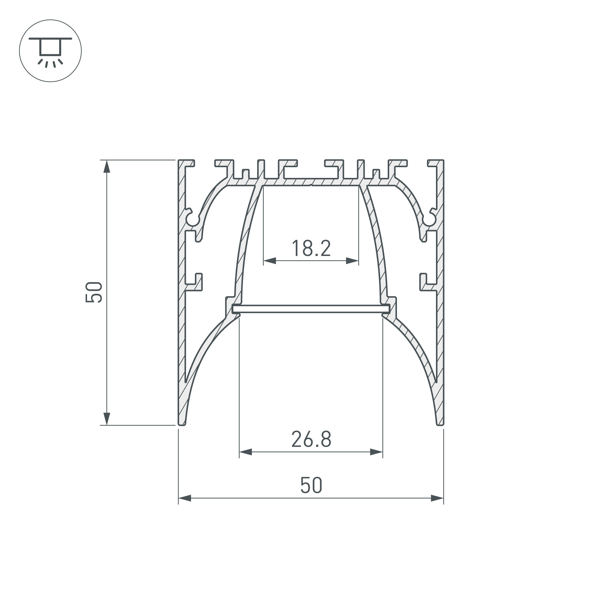Алюминиевый анодированный накладной/подвесной профиль для светодиодных лент и линеек. Габаритные размеры (L×W×H): 2000x50x50 мм. Ширина площадки для ленты 18,2 мм. Экраны, заглушки и другие аксессуары приобретаются отдельно. Цена за 1 метр.