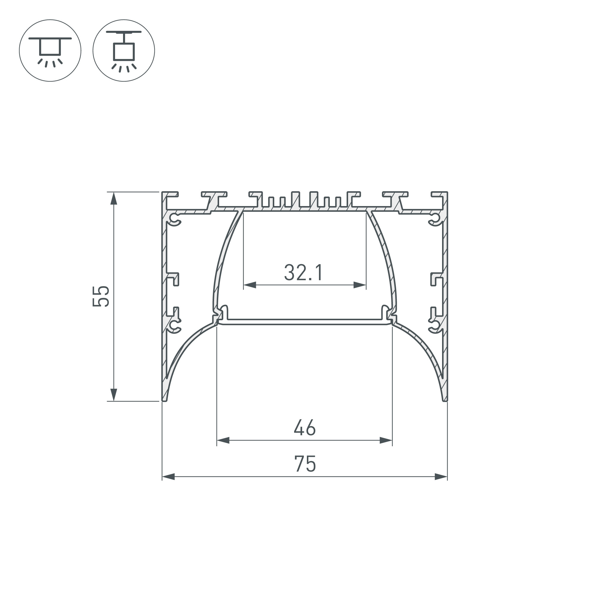 Накладной/подвесной профиль из анодированного алюминия с утопленным экраном для основного освещения и контурной подсветки. Габаритные размеры профиля составляют 2000 мм в длину, 75 мм в ширину и 55 мм в высоту. Площадка для установки светодиодных лент позволяет использовать ленту шириной до 32 мм и мощностью до 68 Вт/м. Это обеспечивает гибкость в выборе светодиодных лент и создает потрясающие световые решения. Экраны, заглушки и другие аксессуары не включены в комплект и приобретаются отдельно. Цена указана за 1 метр профиля. Отличное решение для создания современных световых проектов.
