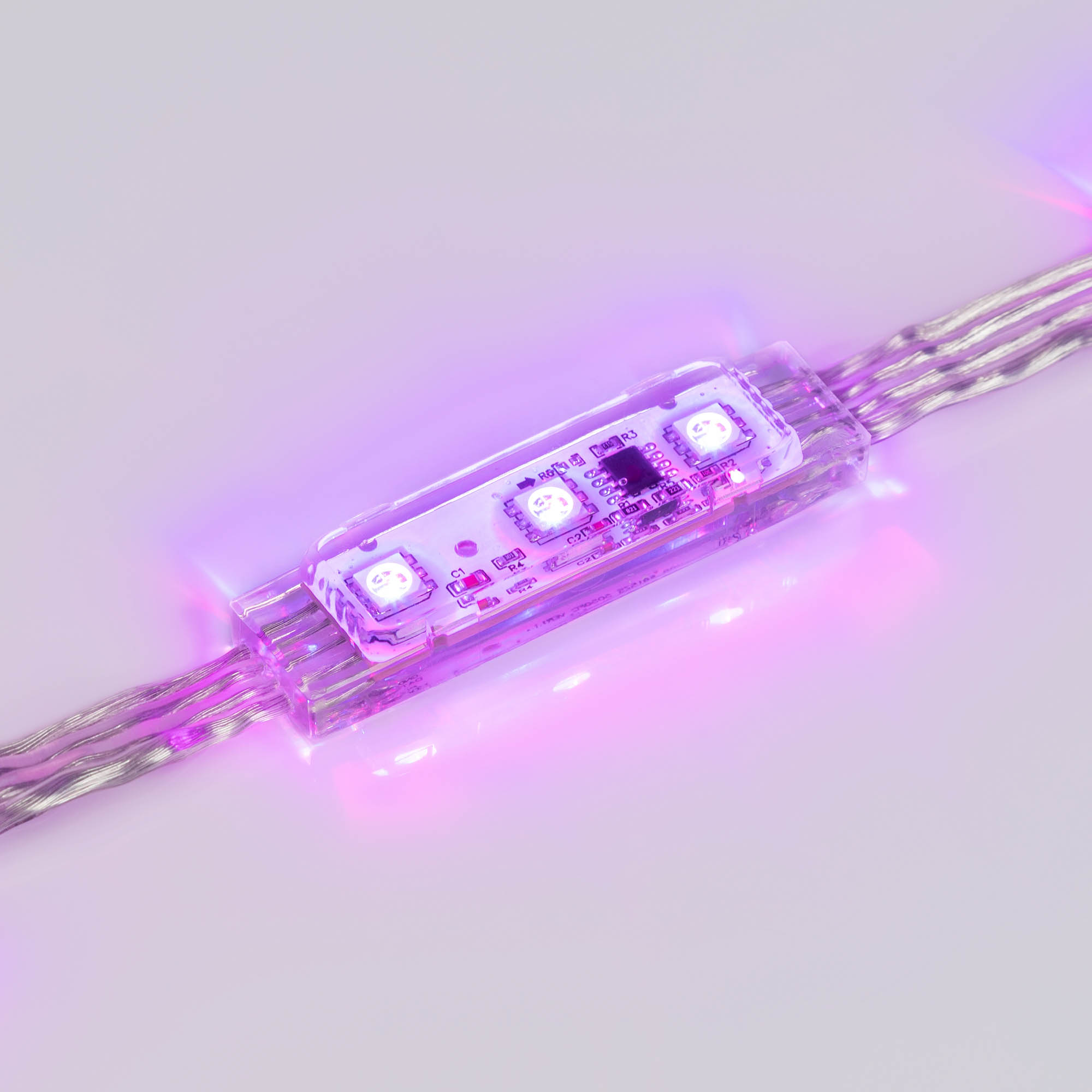 Управляемый светодиодный модуль DMX, RGB, микросхема DMX512 (UCS512), напряжение 12 В, мощность 0.72 Вт, 3 светодиода SMD 5060, угол 140°. Создание медиафасадов, 20 шт на проводе, расстояние между центрами модулей 100 мм, длина провода между модулями 40 мм. Степень пылевлагозащиты IP68. Размер 60x15х10 мм. Гарантия 3 года.