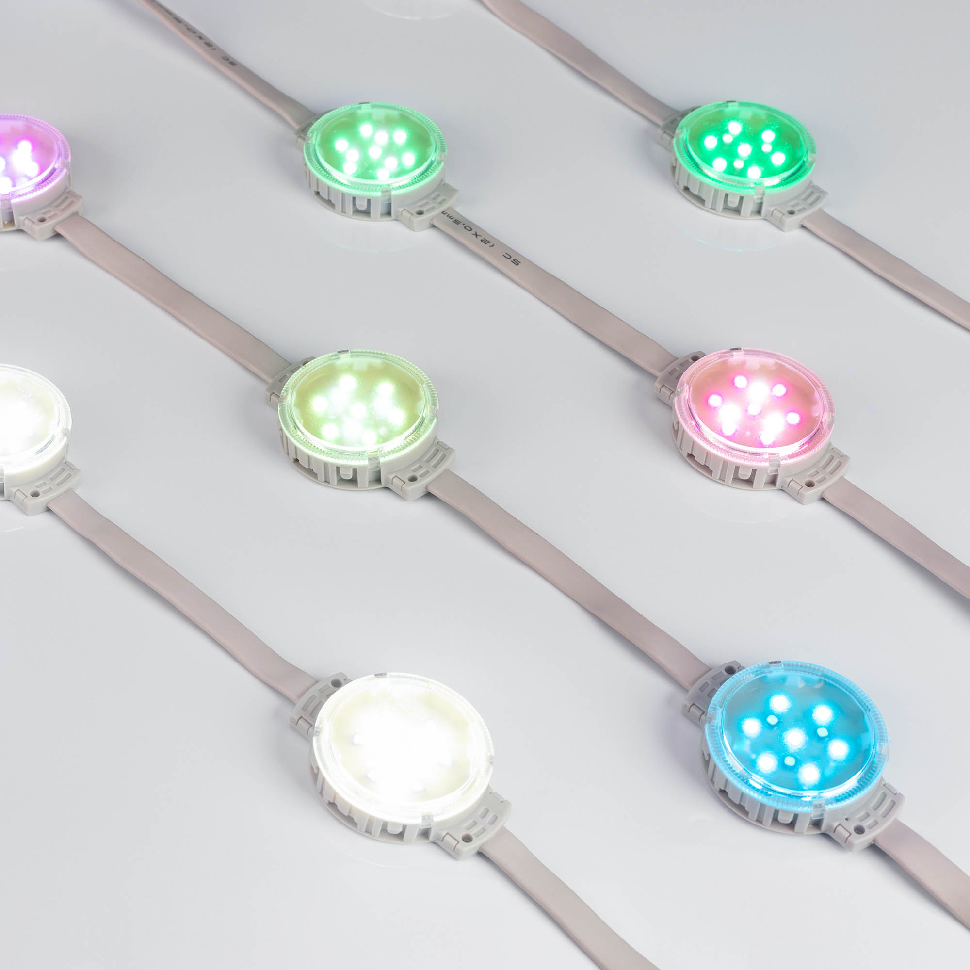 Управляемый светодиодный модуль DMX, RGBW, микросхема UCS512C3, напряжение 24 В, мощность 2 Вт, 10 светодиодов RGB SMD 3535, 3 светодиода White 6000K SMD 3535, угол 120°. Создание медиафасадов, 30 шт на проводе, расстояние между центрами модулей 170 мм, длина провода между модулями 105 мм. Степень пылевлагозащиты IP68. Размер Ø50×66×15 мм. Гарантия 3 года.