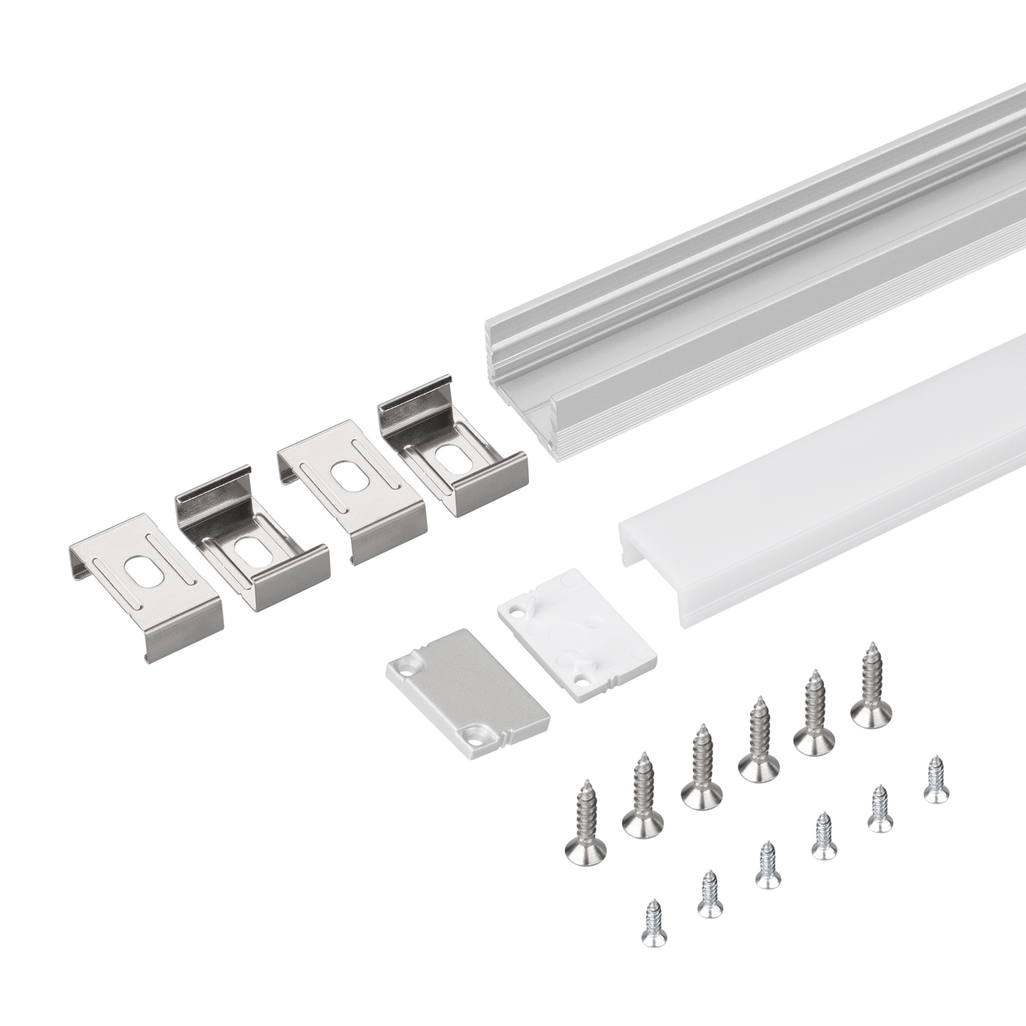 Комплект с экраном, в картонной коробке. Алюминиевый анодированный профиль для светодиодных лент и линеек. Габаритные размеры (L×W×H): 2000x20x13 мм. Ширина площадки для ленты 15 мм. Цена за комплект: профиль - 2 м, экран - 2 м, глухая заглушка - 2 шт., держатель - 4 шт.