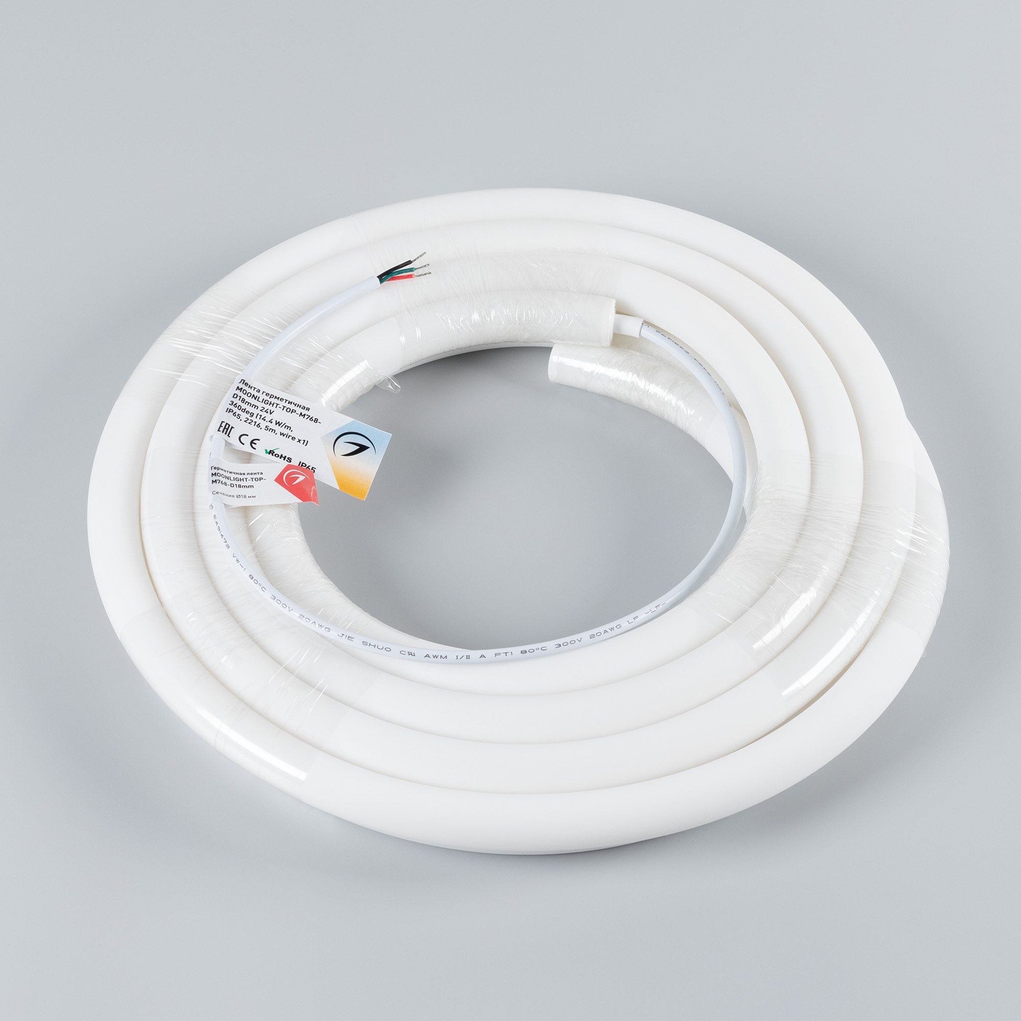 Светодиодная лента герметичная MOONLIGHT-TOP-M768-D18mm 24V White-MIX 360deg (14.4 W/m, IP65, 2216, 5m, wire x1) (Arlight, Вывод прямой, 3 года)