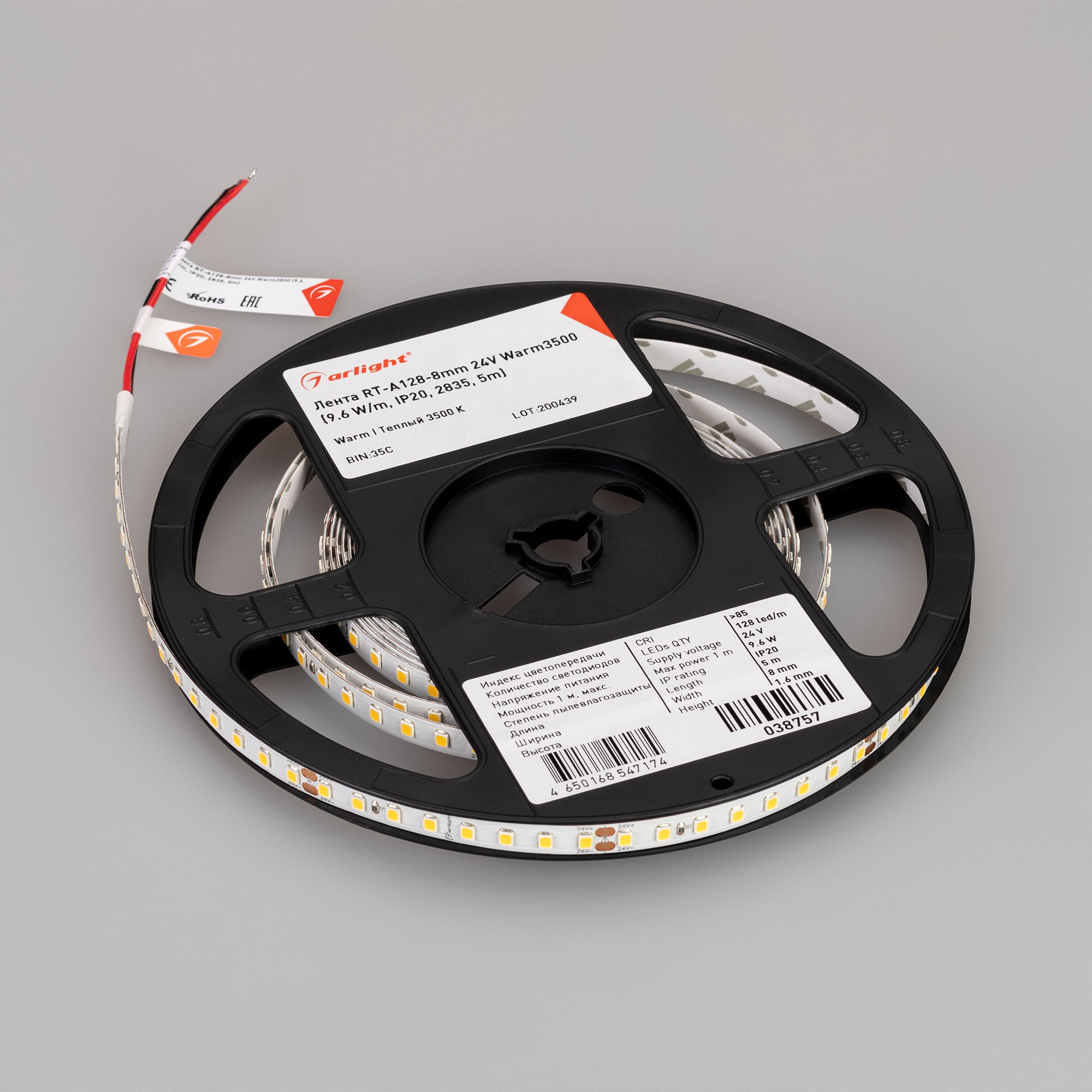 Высокоэффективная светодиодная лента RT серии A128. Напряжение питания 24 В, мощность 9.6 Вт/м, ширина 8 мм. Светодиоды SMD 2835, 128 шт/м, теплого цвета свечения (3500K). Индекс цветопередачи CRI>85. Применяется для энергоэффективного освещения (эффективность 150 лм/Вт). Равномерная засветка больших поверхностей. Подсветка рекламных конструкций и витрин. Декоративная подсветка интерьера, потолочных ниш.