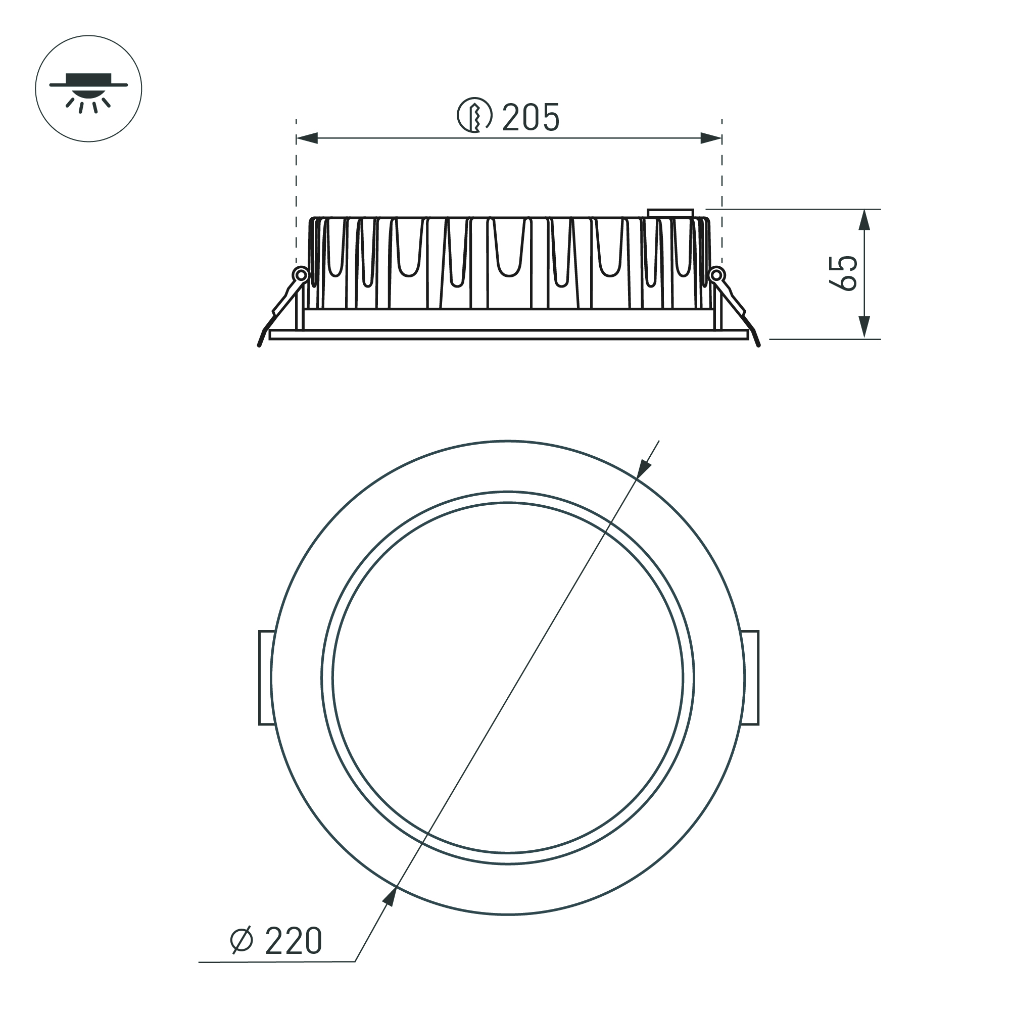 Встраиваемый светильник даунлайт. Мощность 30 Вт, св. поток 2660 лм, 89 лм/Вт, дневной 4000 K, CRI>90, угол 110°, напряжение питания 230 В. Белый круглый корпус из алюминия, экран PMMA, степень защиты IP54. Размер: диаметр 220 мм, высота 65 мм. Монтаж встраиваемый, установочное отверстие: диаметр 205 мм. Драйвер IP54, 27-43 В, 700 мА, пульсация <3%.